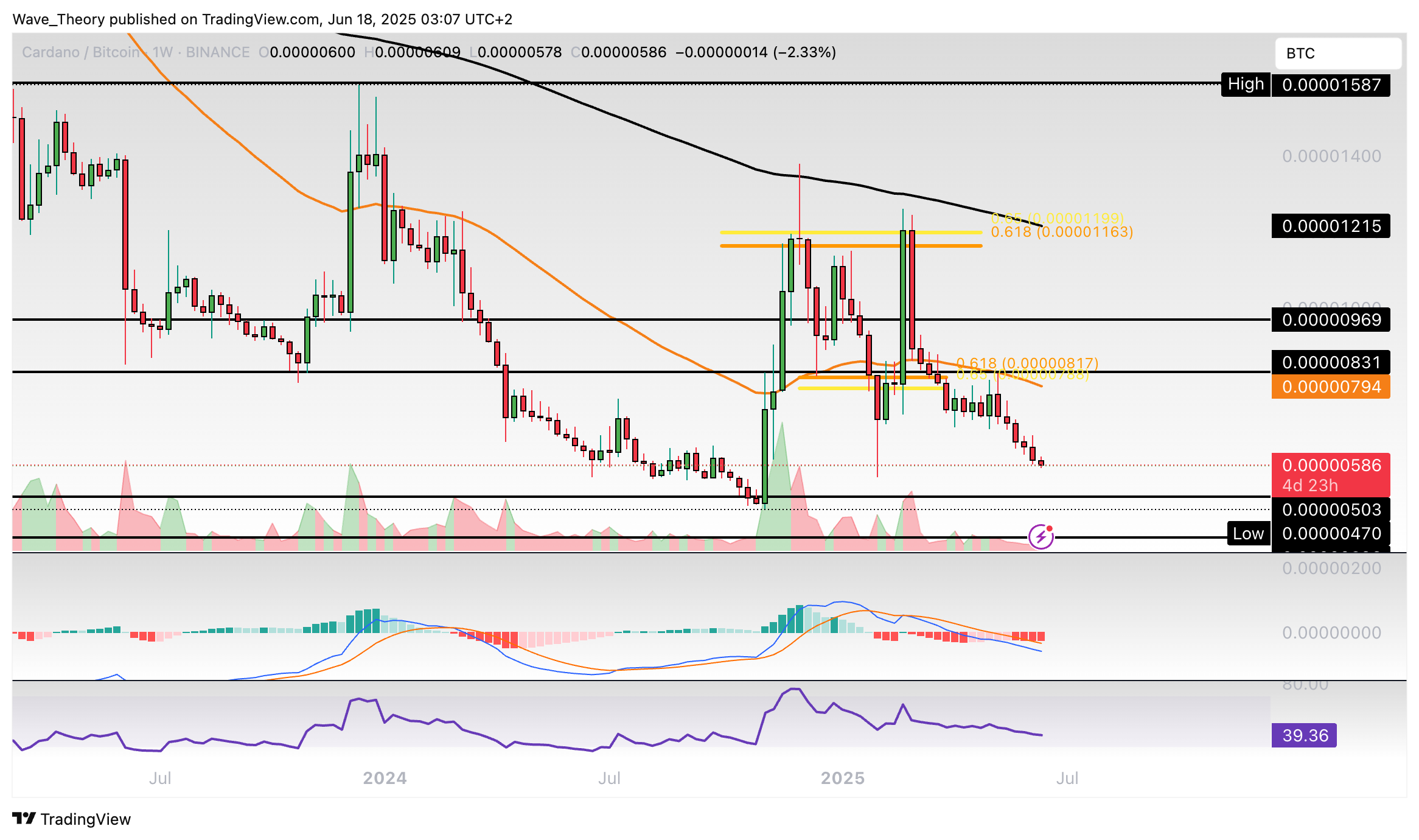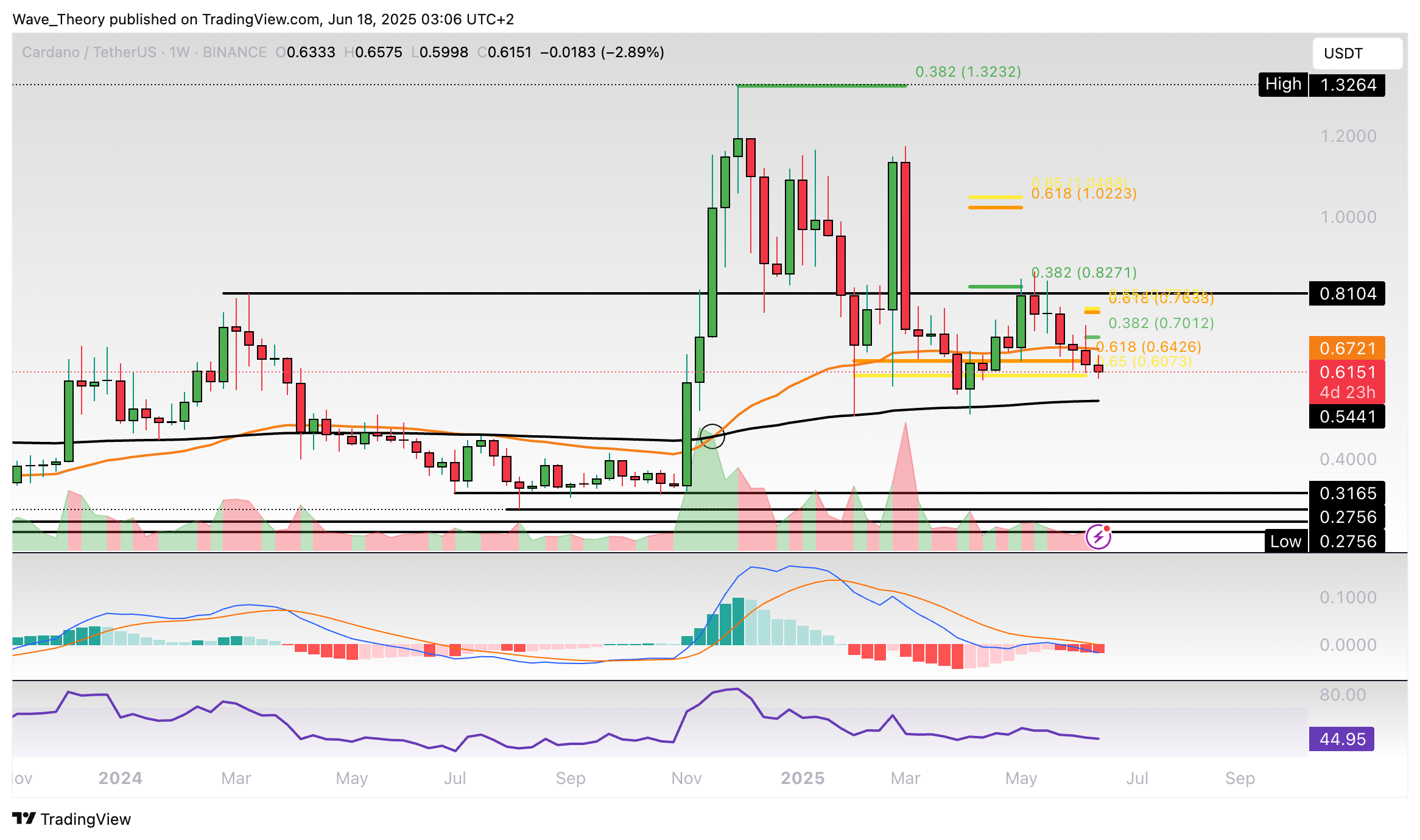 Cardano konnte zuvor an der Golden Ratio Unterstützung bullisch abprallen. Nach einer bärischen Abweisung am Widerstand ist Cardano jetzt erneut zur Golden Ratio Unterstützung korrigiert.