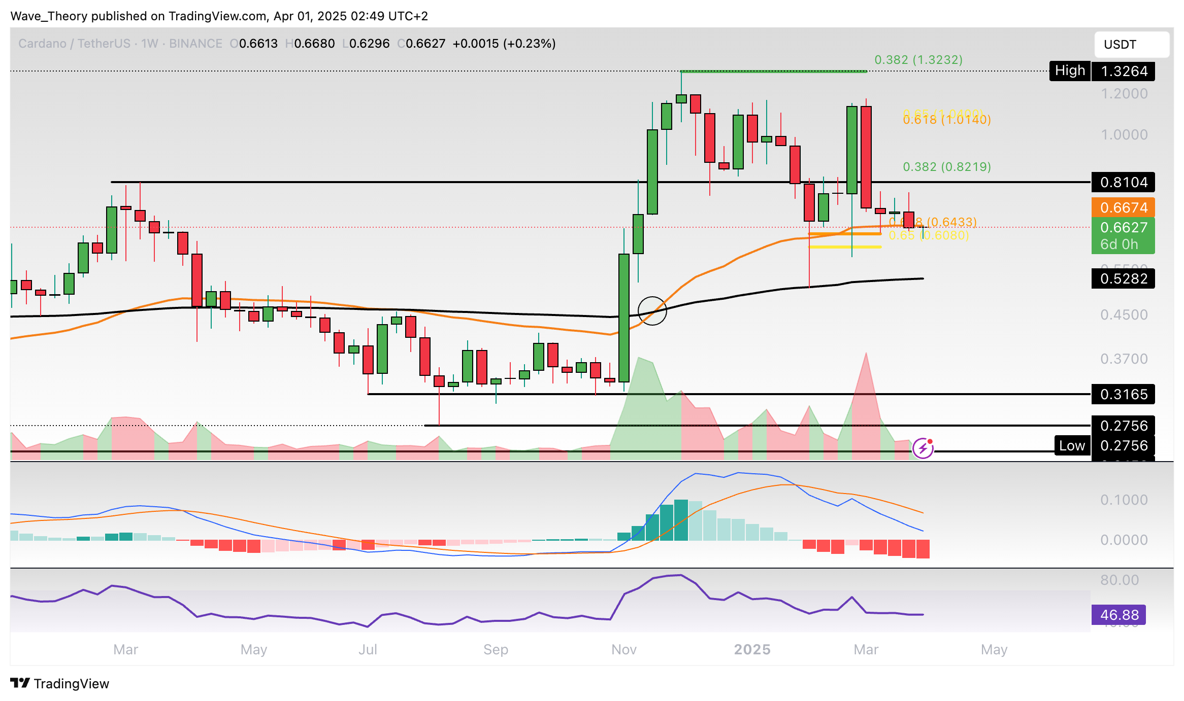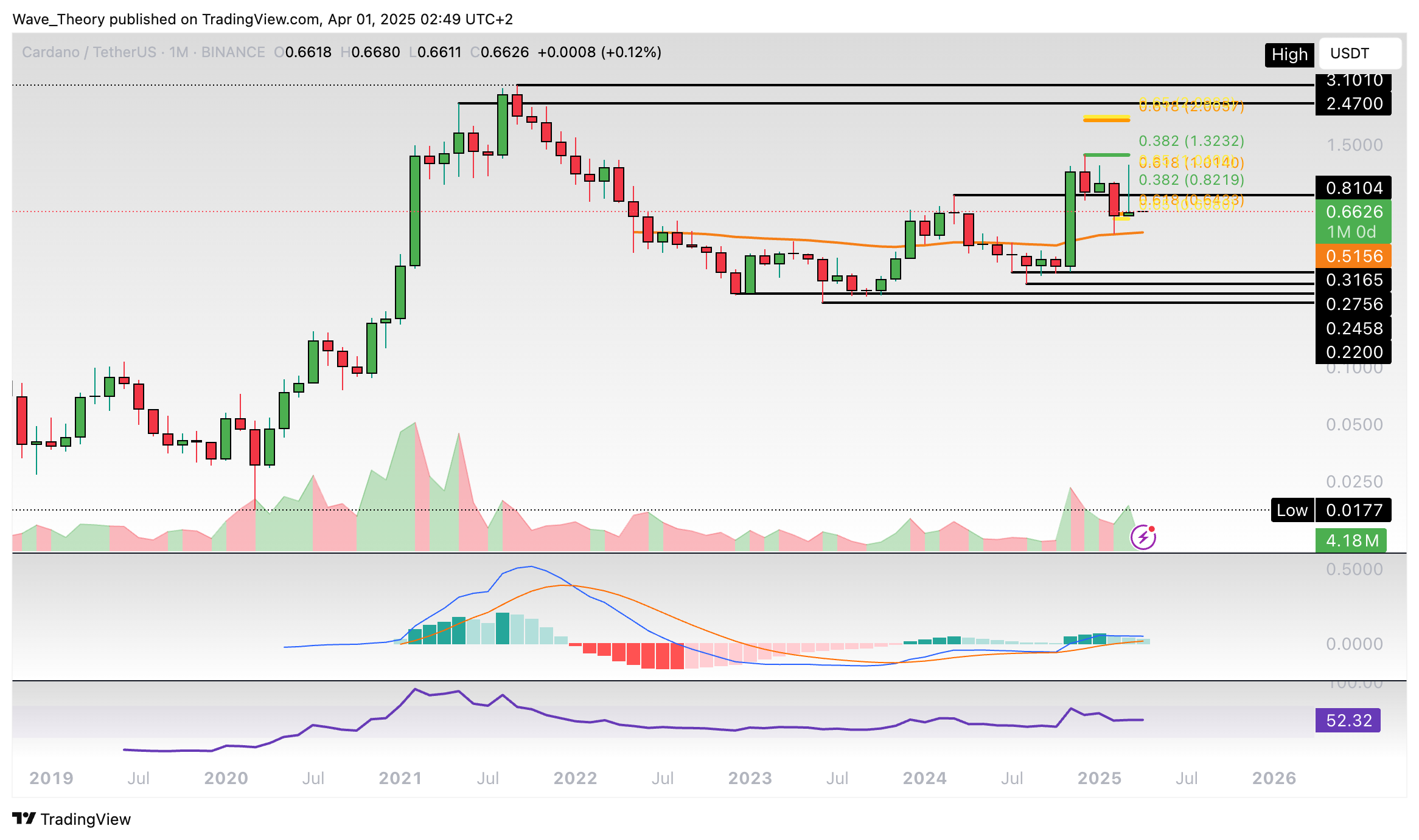 Sollte Cardano diese brechen, könnte der Kurs erneut zum 50-Monate-EMA bei rund 0,515 USD zurückkehren.
