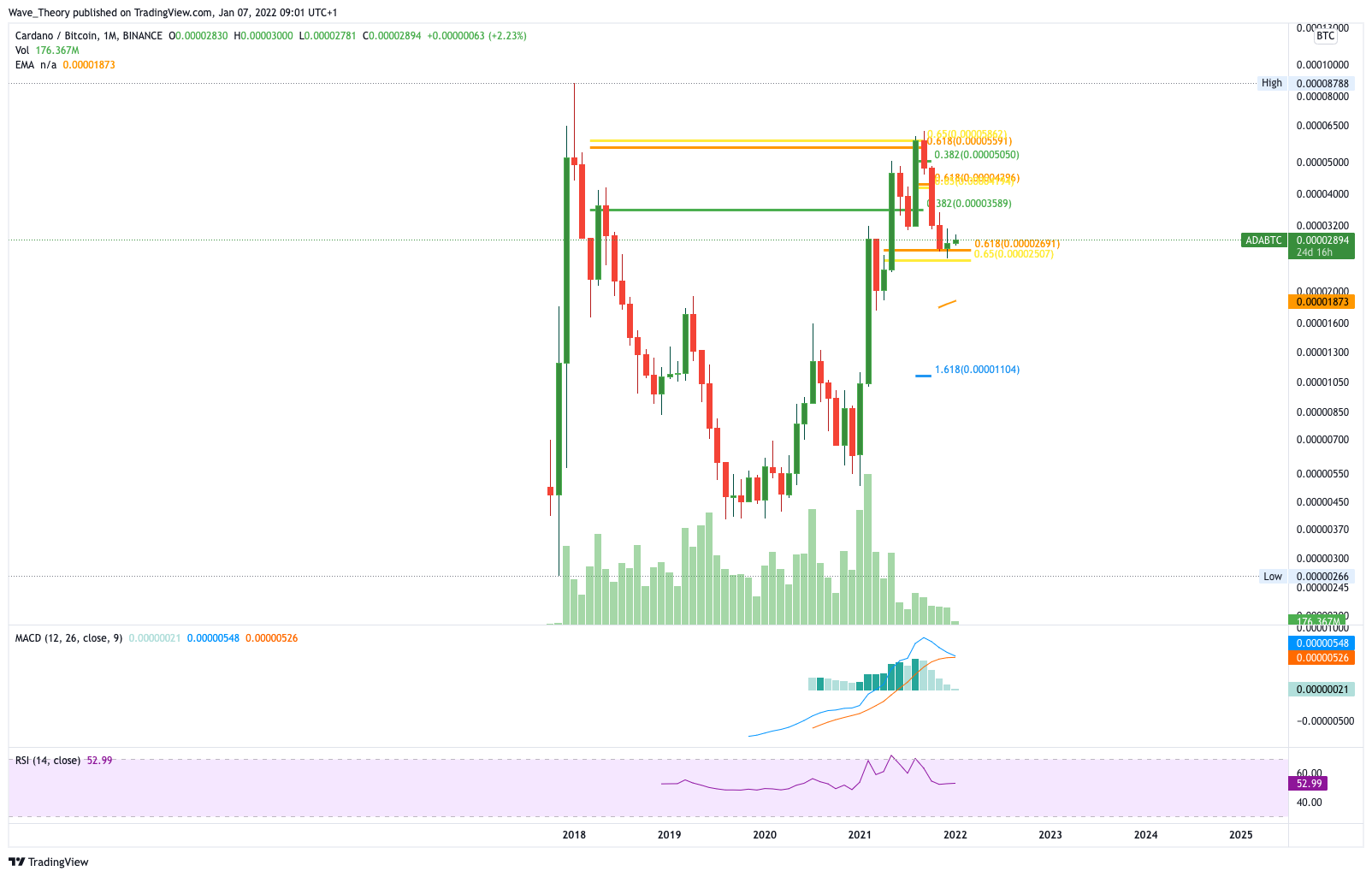 Gegen BTC befindet sich der Cardano Kurs ebenfalls an der Golden Ratio Unterstützung. Im Gegensatz zum USD-Chart prallt Cardano gegen BTC dort aber bereits ab. Sollte die Golden Ratio Unterstützung bei rund 0,000027 BTC halten, könnte Cardano bis rund 0,000036 BTC steigen.