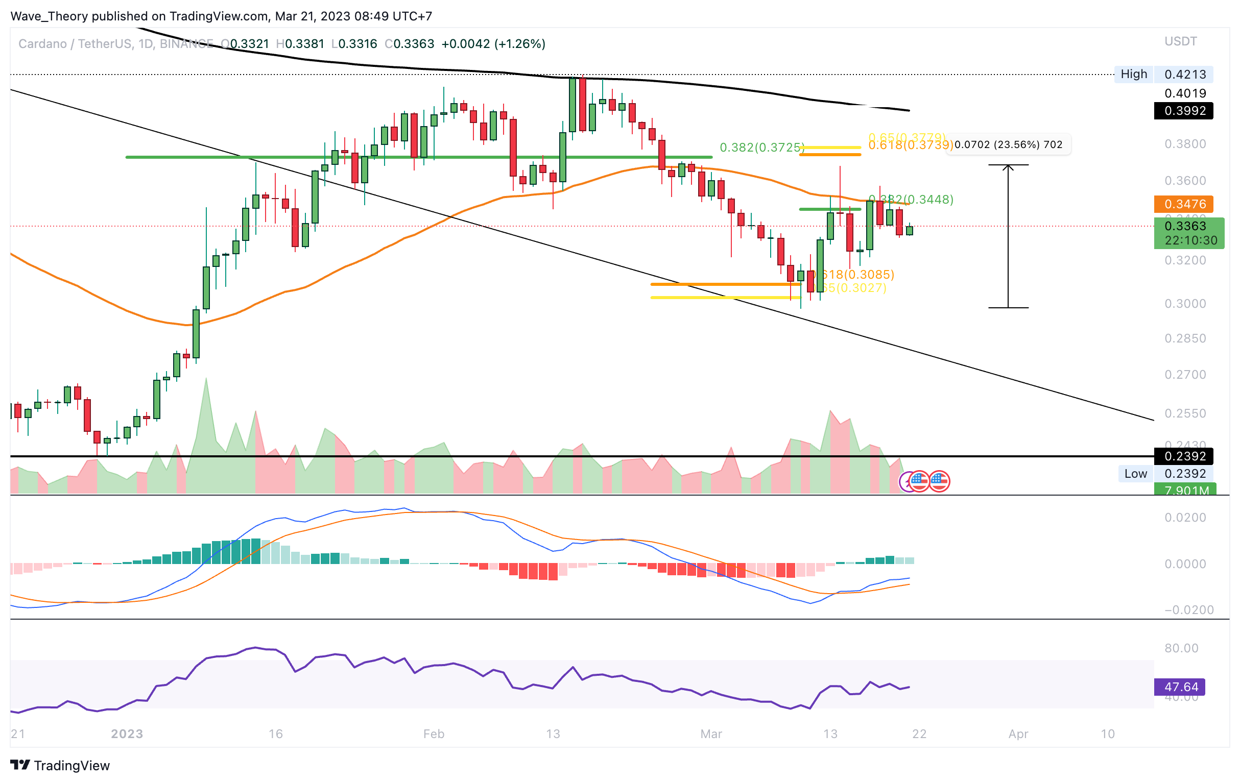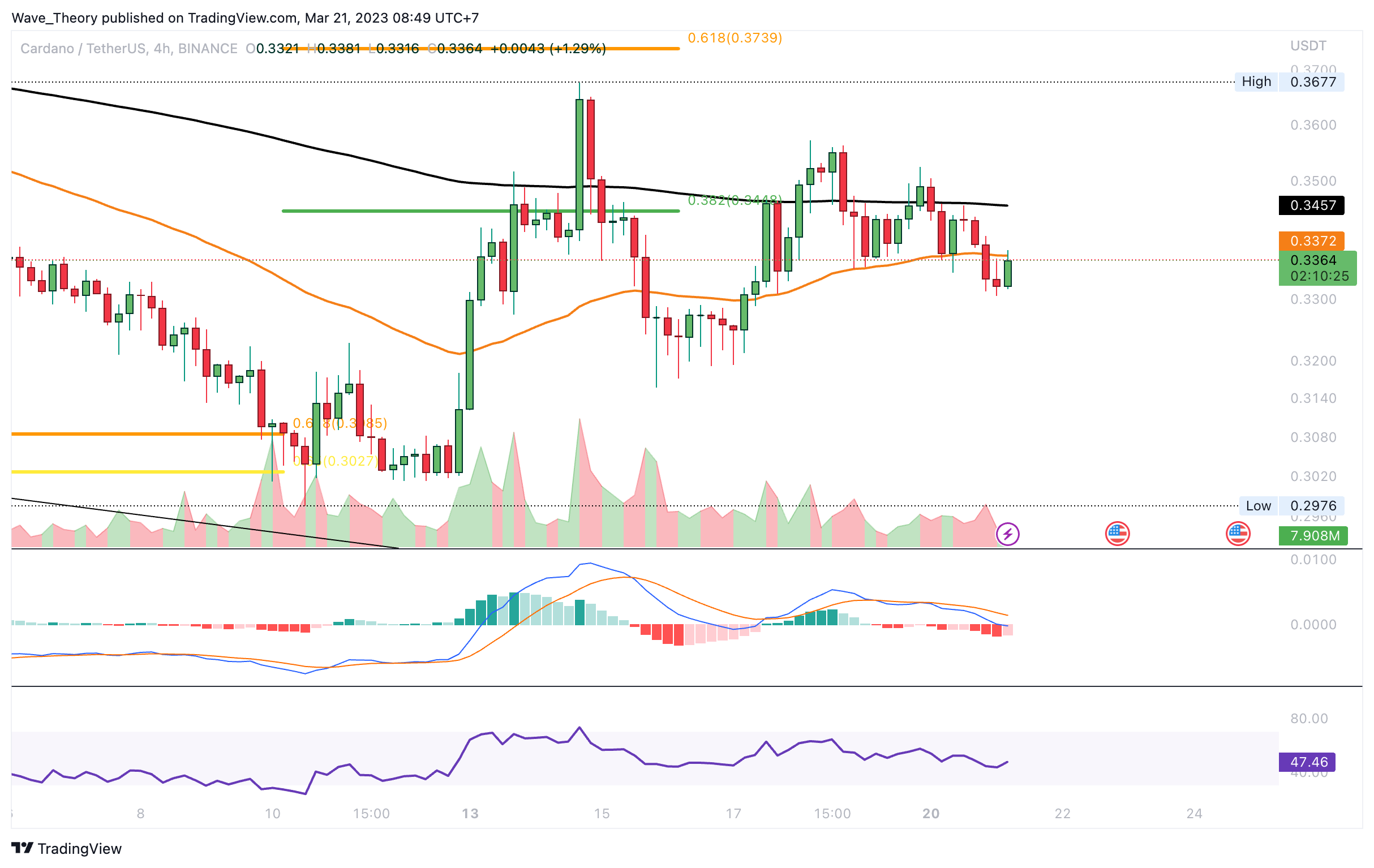 Auch den 50-Tage-EMA Widerstand bei rund 0,3476 USD konnte Cardano nicht brechen. Stattdessen wurde Cardano daran bärisch abgewiesen. Doch jetzt könnte Cardano erneut den Versuch unternehmen, den 50-Tage-EMA bei rund 0,3476 USD zu brechen, um die Golden Ratio bei rund 0,375 USD anzuvisieren.