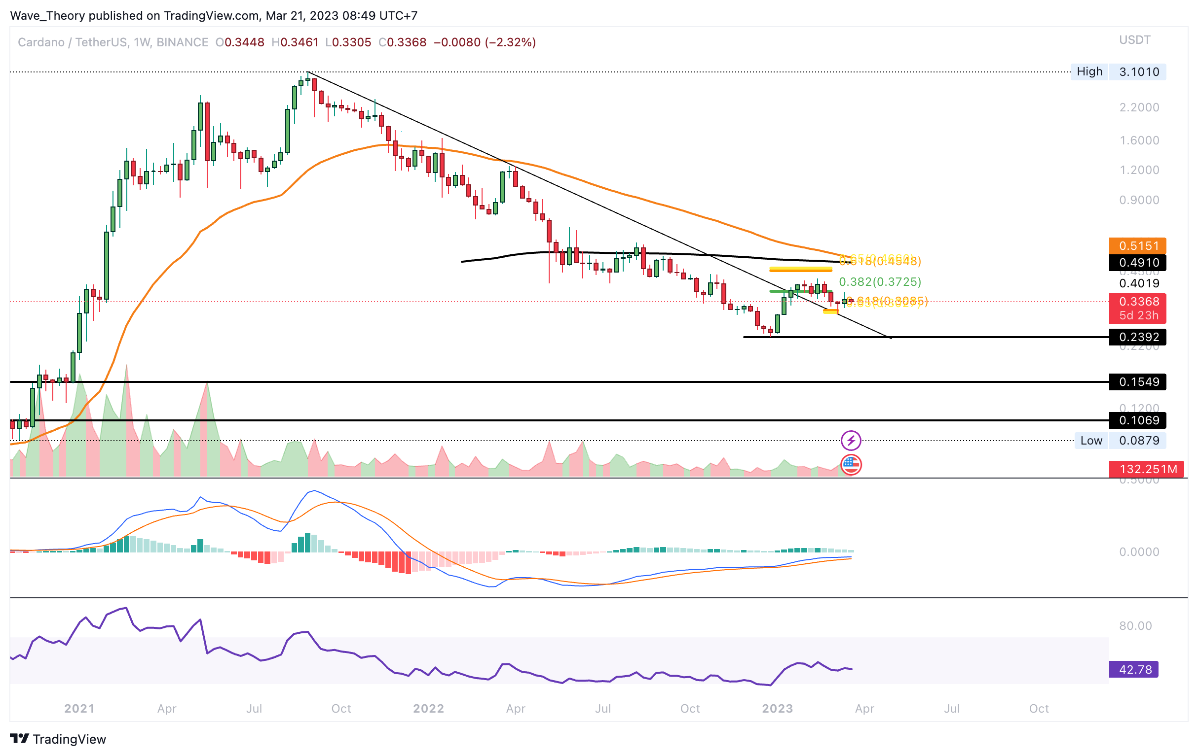 Sponsored- Der ADA Kurs wurde Mitte Februar am 200-Tage-EMA Widerstand bei rund 0,4 USD bärisch abgewiesen und initiierte daraufhin eine starke Korrektur.