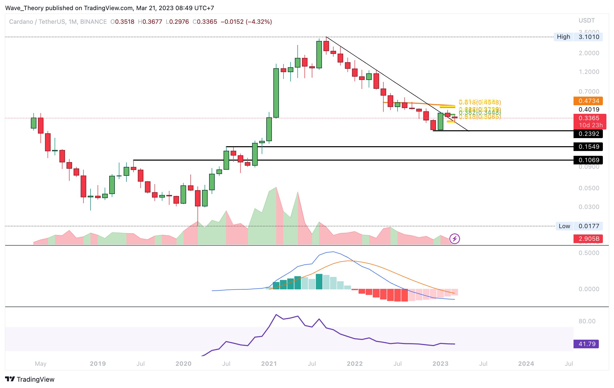 Im Monatschart tickt das Histogramm des MACDs jedoch nach wie vor bullisch höher. Die MACD Linien sind dabei aber noch bärisch überkreuzt und der RSI zeigt sich neutral. Wenn Cardano die Golden Ratio Unterstützung bei rund 0,3 USD bricht, wartet bei rund 0,239 USD die nächste signifikante Unterstützung.