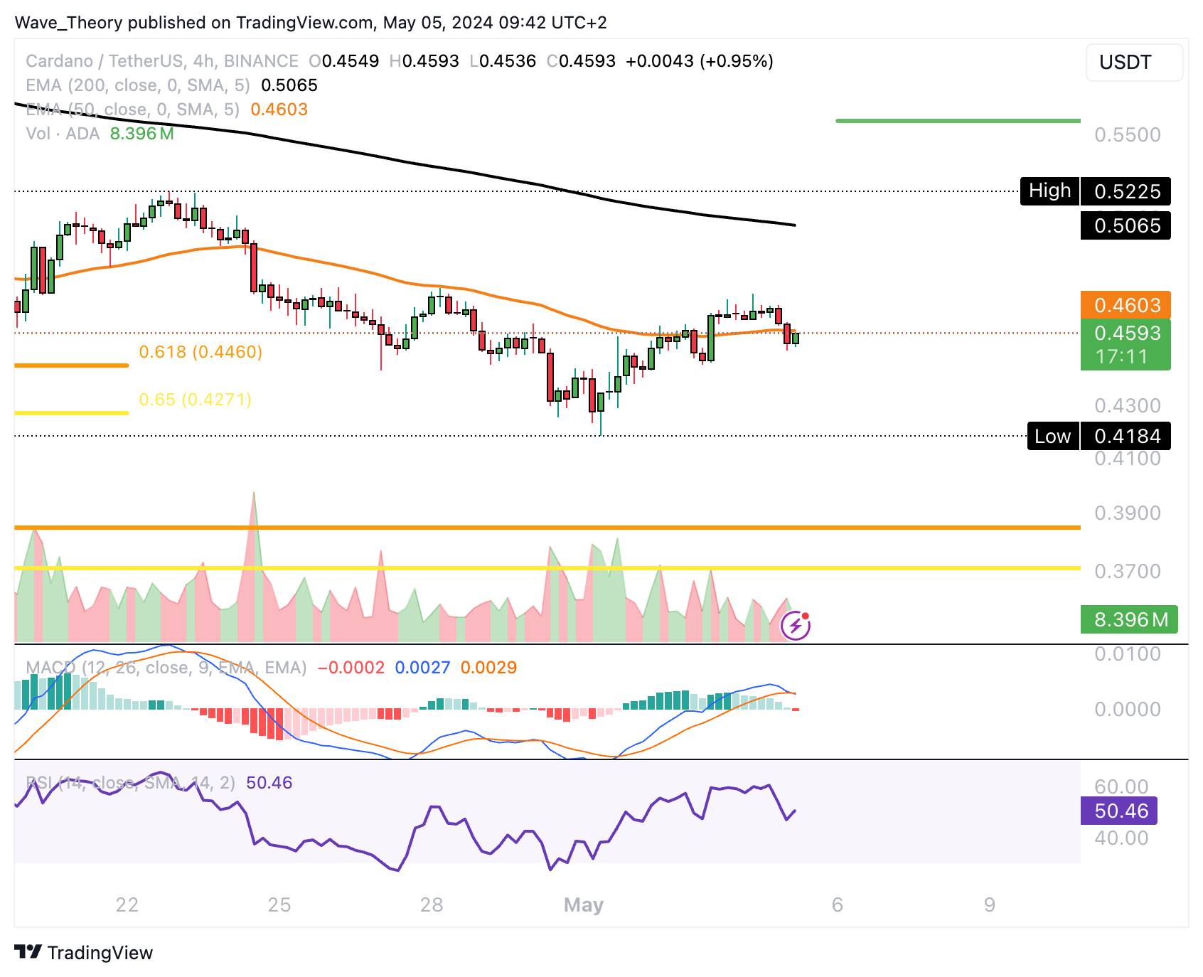 Sollte Cardano bullisch ausbrechen, könnte der ADA Preis zumindest bis zum 200-Tage-EMA bei rund 0,514 USD zurückkehren. Etwas höher, bei rund 0,525 USD, fungiert der 50-Tage-EMA als weiterer Widerstand.