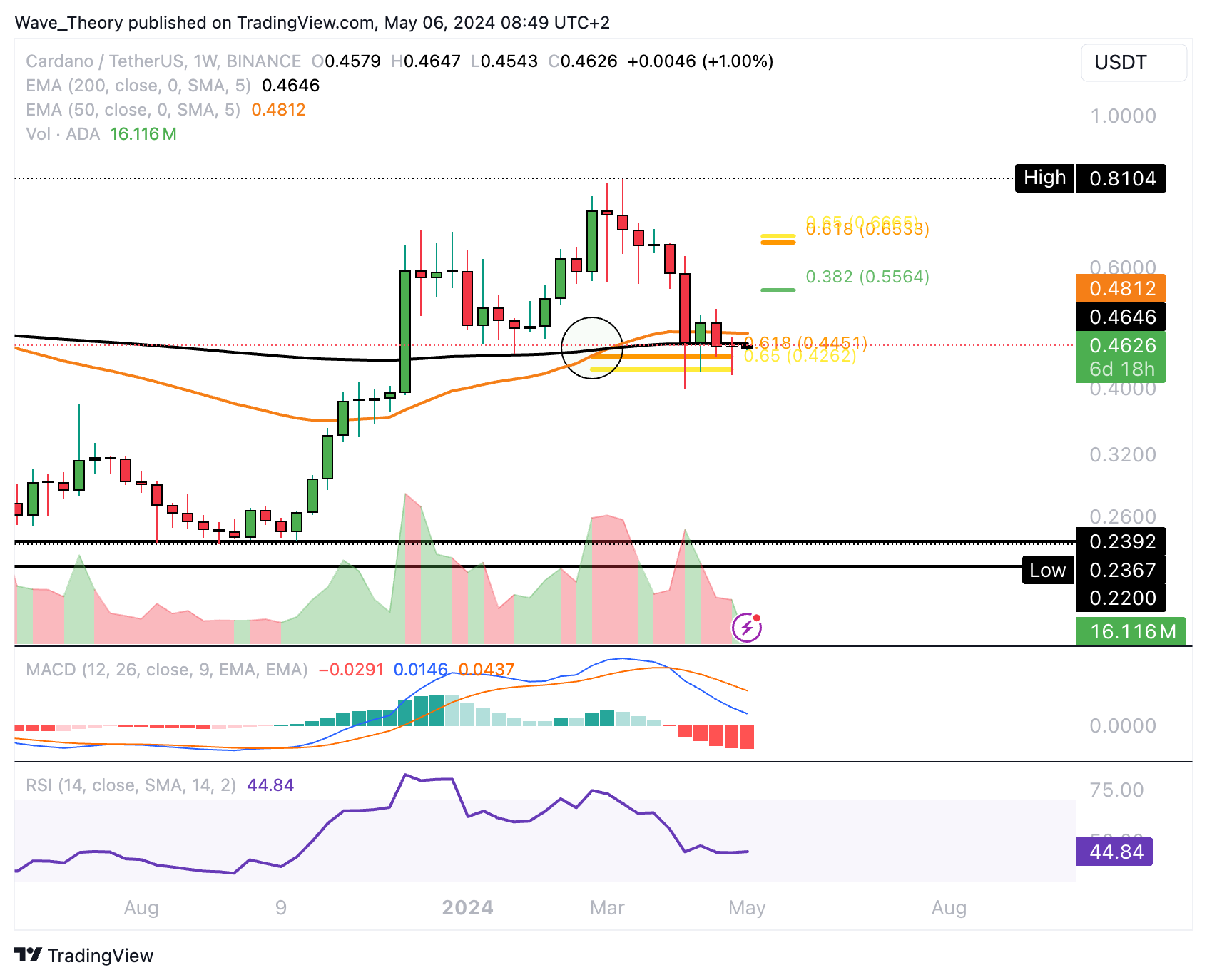 Seit dem lokalen Hochpunkt vorletzten Monat ist der Kurs von Cardano bereits rund 51 % gefallen. Letzten Monat erreichte Cardano dabei die Golden Ratio Unterstützung bei rund 0,44 USD.