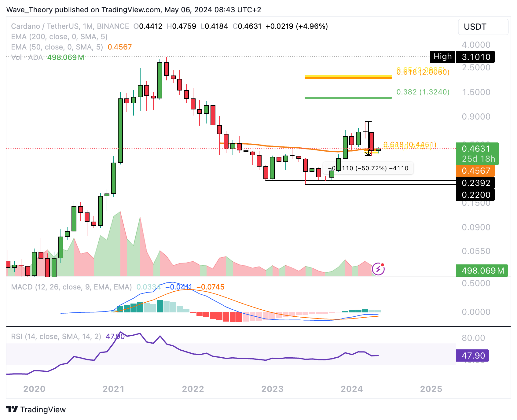Dort scheint der Kurs in diesem Monat bullisch abprallen zu können. Zudem fungiert der 50-Monate-EMA bei rund 0,457 USD als zusätzliche Unterstützung.