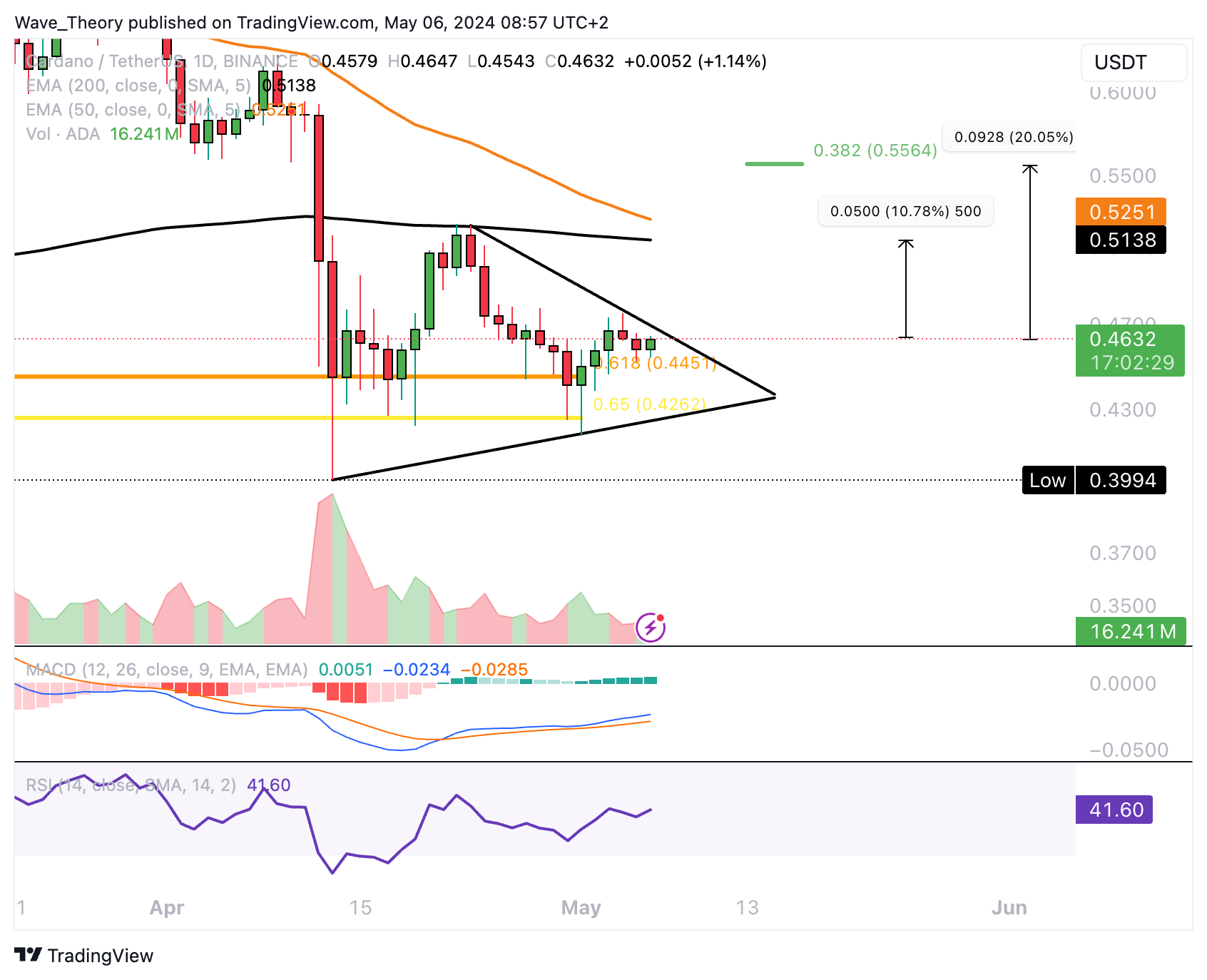 Der ADA Kurs befindet sich in einem symmetrischen Dreieck und formt sowohl höhere Tiefpunkte als auch tiefere Hochpunkte. Zuvor wurde Cardano am 200-Tage-EMA bei rund 0,514 USD bärisch abgewiesen.