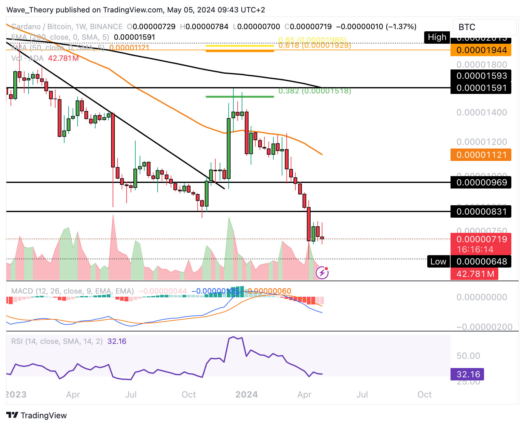 Zudem weisen die EMAs ein Death Cross im Wochenchart auf, womit der Trend mittelfristig bärisch bestätigt ist. Mittelfristig könnte Cardano auf die nächste signifikante Unterstützungszone zwischen ungefähr 0,000004 BTC und 0,000005 BTC zurückfallen.