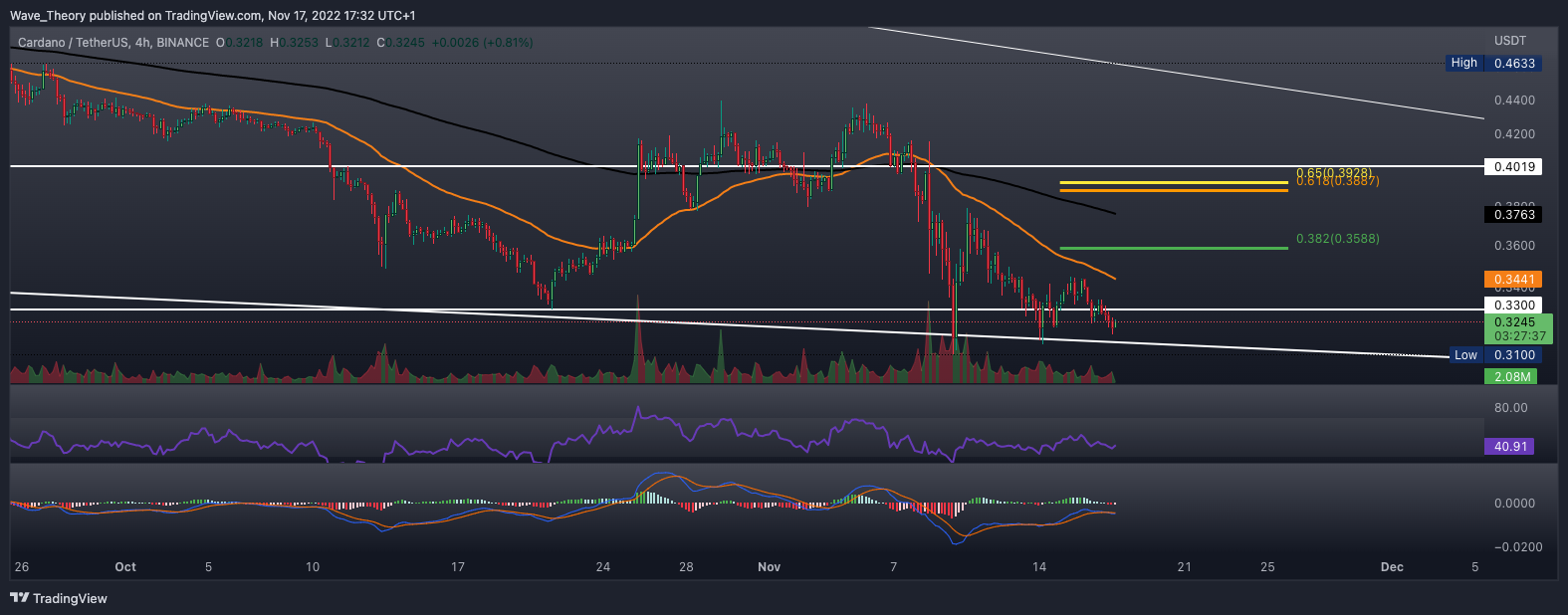 Nach unserer letzten Cardano Kurs Prognose ist der ADA Kurs auf 0,44 USD gestiegen und hat dabei ein bärisches Kursmuster geformt, um anschließend eine starke Korrektur einzuleiten. In Zuge der Korrektur erreichte der ADA Kurs ein neues Jahrestief von 0,31 USD. Dort konnte der ADA Kurs zwar stark abprallen, dabei aber nicht den Golden Ratio Widerstand am 50-Tage-EMA bei rund 0,387 USD brechen.