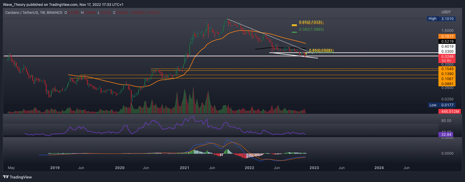 Im Wochenchart beginnt das Histogramm des MACDs bärisch tiefer zu ticken. Die MACD Linien sind dabei aber noch bullisch überkreuzt. Insgesamt zeigt sich der Cardano Kurs sehr bärisch.