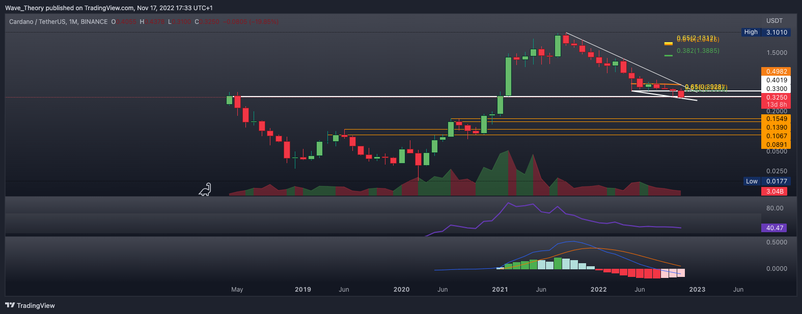 Im Monatschart tickt das Histogramm des MACDs dennoch weiterhin bullisch höher, was einen Hinweis auf eine Bodenbildung gibt. Nach oben hin fungiert der 50-Monate-EMA bei rund 0,5 USD als Schlüsselwiderstand, denn mit einem bullischen Bruch könnte Cardano einen neuen Aufwärtszyklus beginnen.
