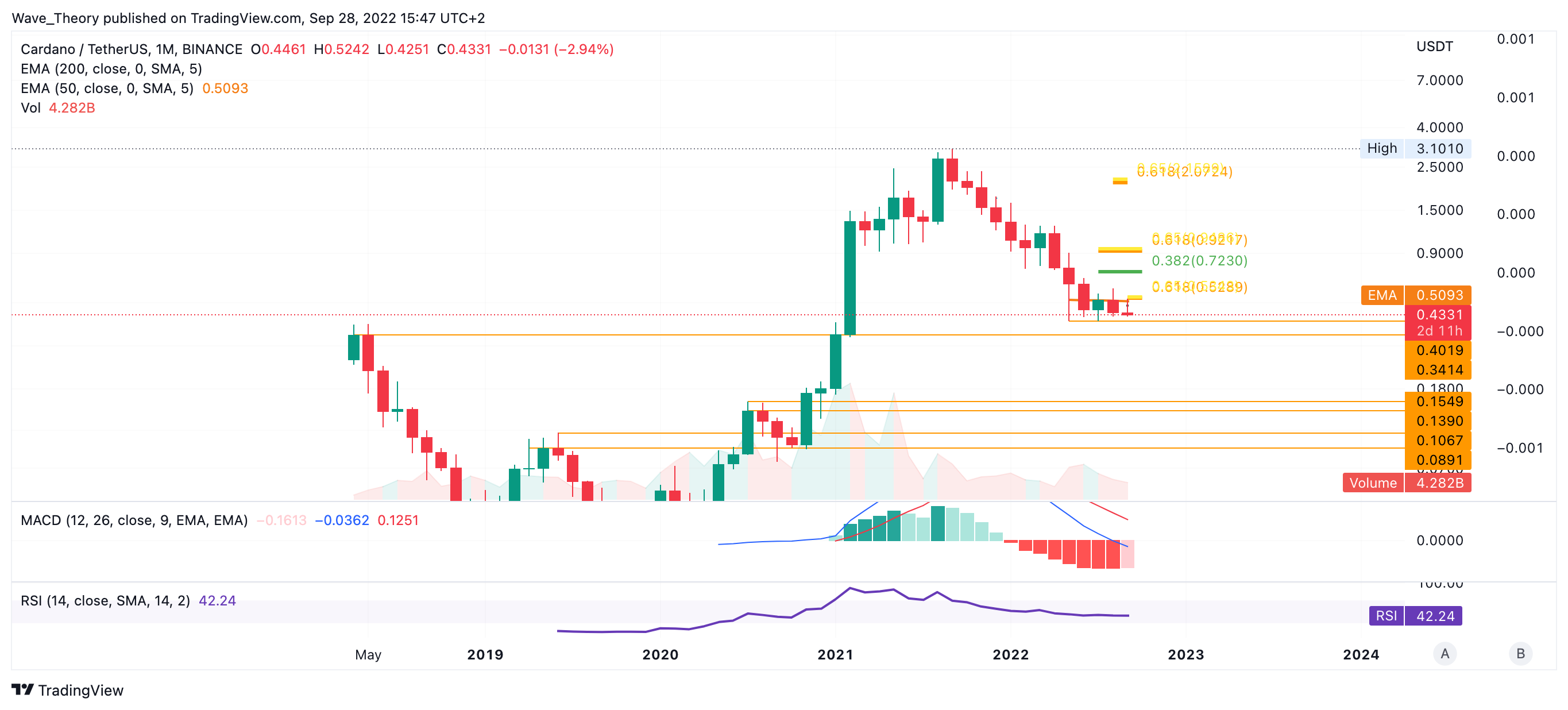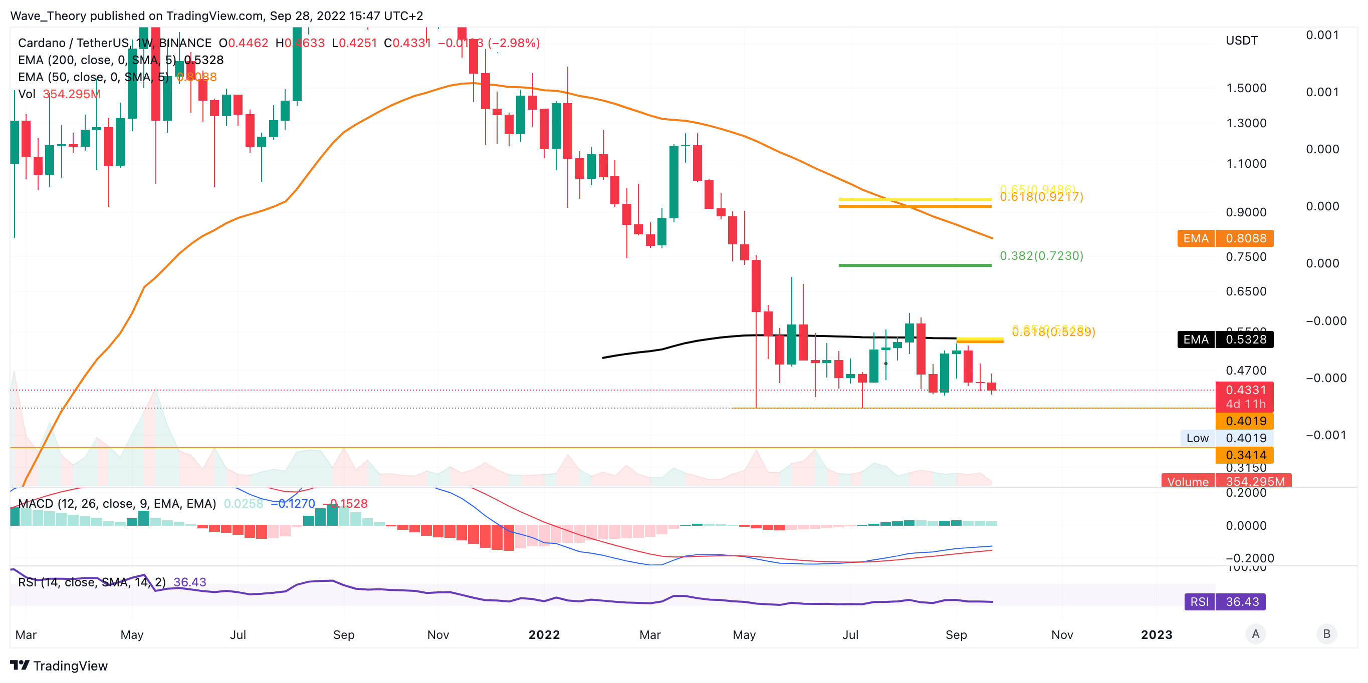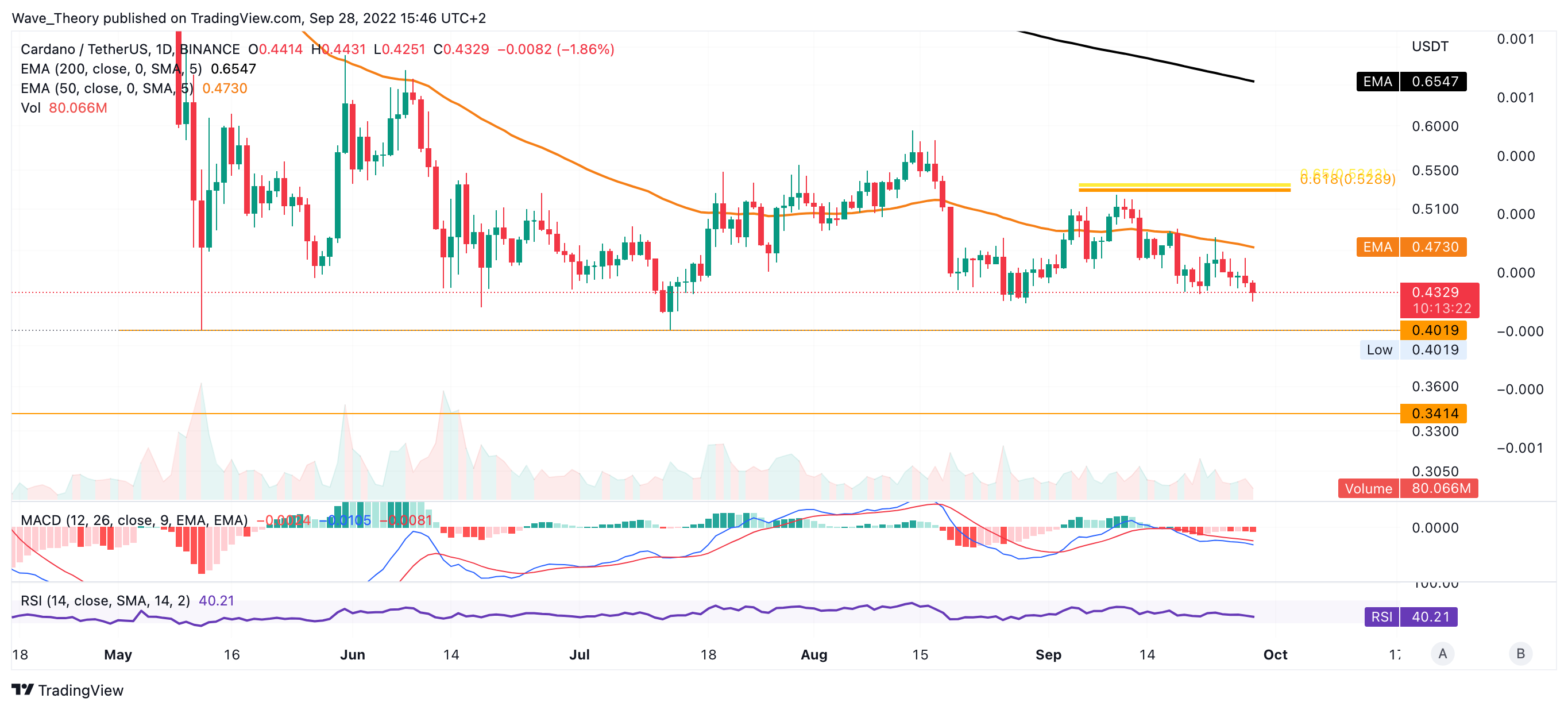 Die letzte Cardano Kurs Prognose liegt bereits eine Woche zurück. Damals schrieben wir: “Der Cardano Kurs erreichte den 50-Tage-EMA bei rund 0,49 USD und wurde daran stark bärisch abgewiesen. Damit könnte der Cardano Kurs jetzt erneut zum lokalen Tiefpunkt bei rund 0,4 USD zurückkehren.