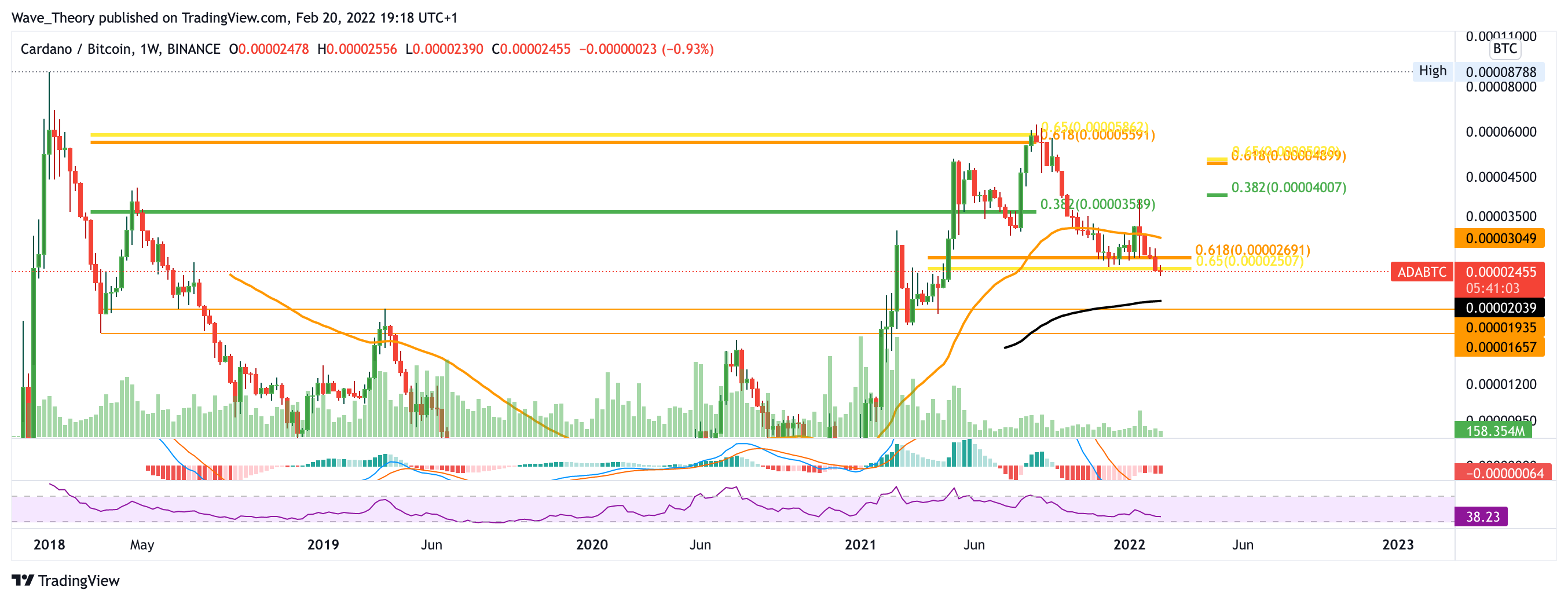 Auch gegen BTC könnte Cardano bis zum 200-Wochen-EMA korrigieren
