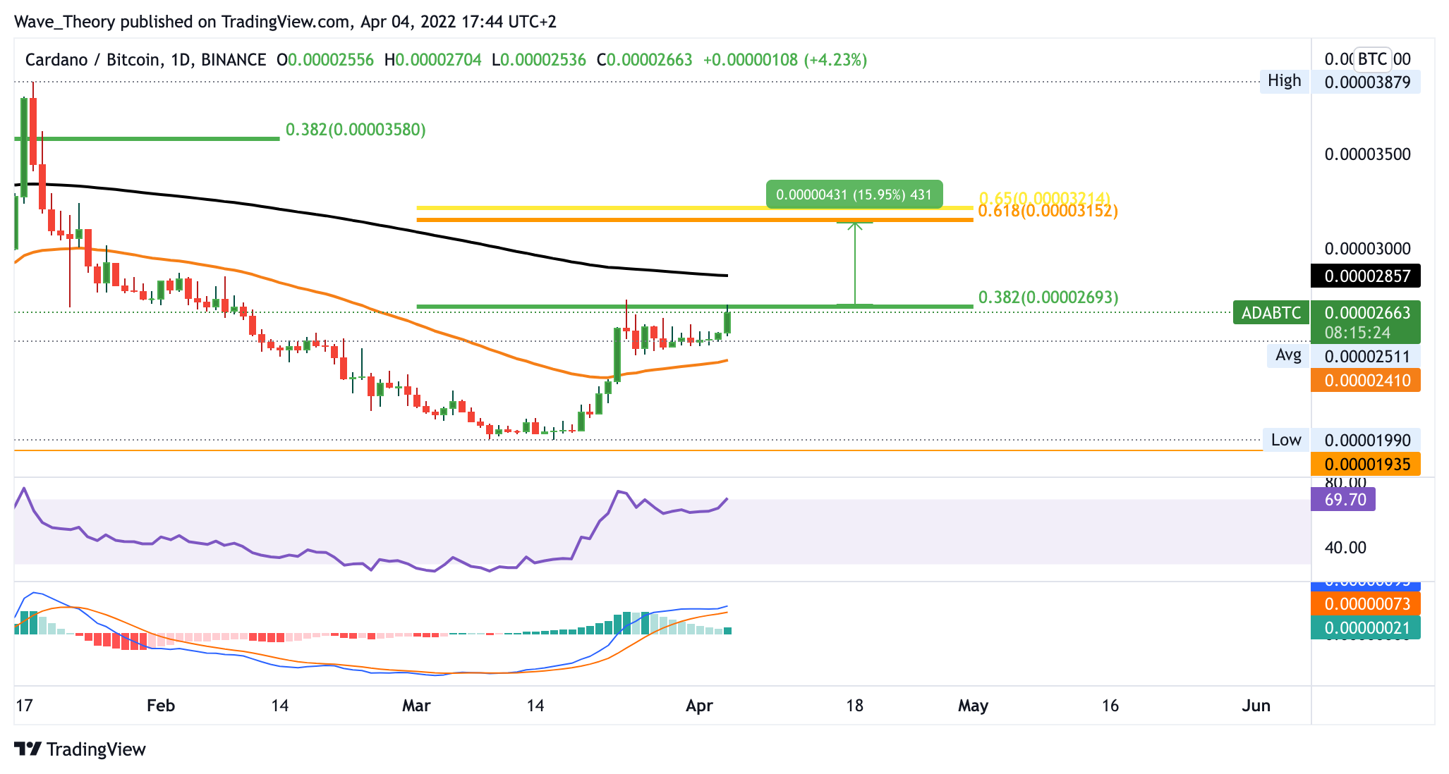 Im Tageschart unternimmt der Cardano Kurs den zweiten Versuch, das 0,382 Fib Niveau bei rund 0,000027 BTC zu brechen. Dabei könnte Cardano eine bärische Divergenz im RSI aufbauen, um an der Golden Ratio, rund 16 % höher, abgewiesen zu werden. Bis jetzt sieht es aber insgesamt eher bullisch aus und auch der MACD zeigt sich bullisch.