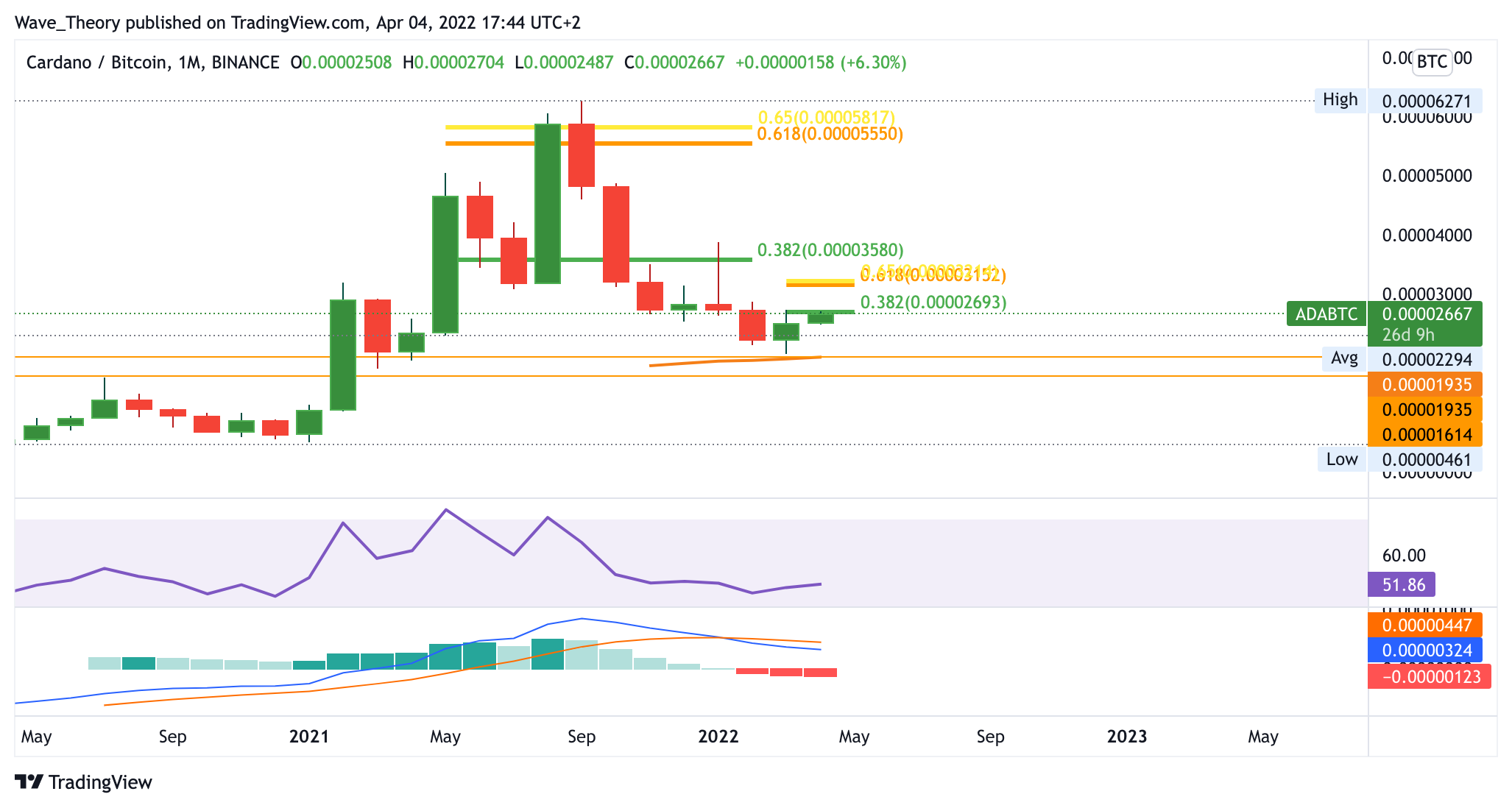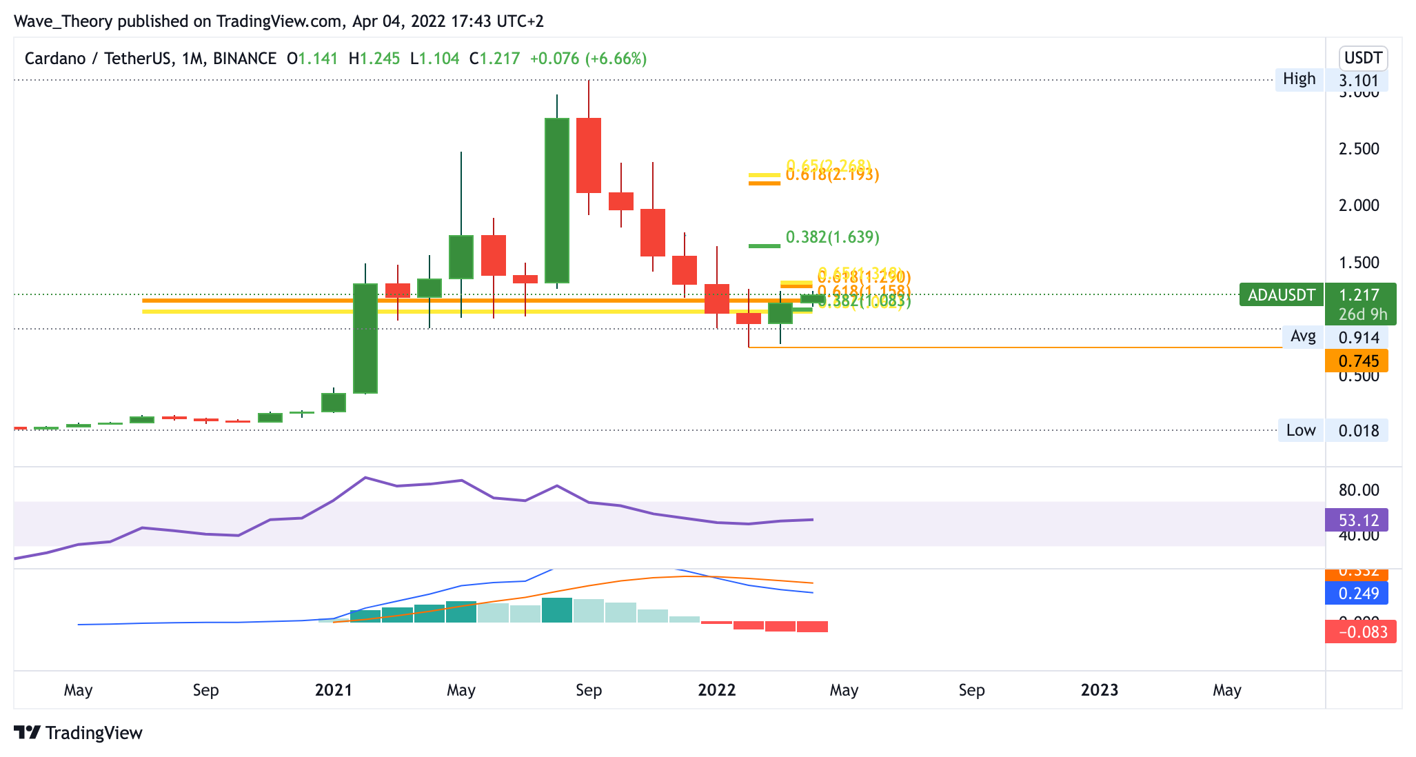 Sollte der Cardano Kurs die Golden Ratio bei rund 2,2 USD brechen, kann der ADA Kurs auch wieder auf rund 3 USD steigen. Im Monatschart zeigt sich der MACD jedoch noch immer eindeutig bärisch, denn die MACD Linien sind bärisch überkreuzt und auch das Histogramm tickt bärisch tiefer.