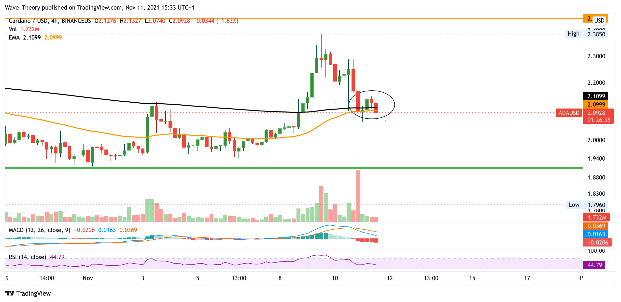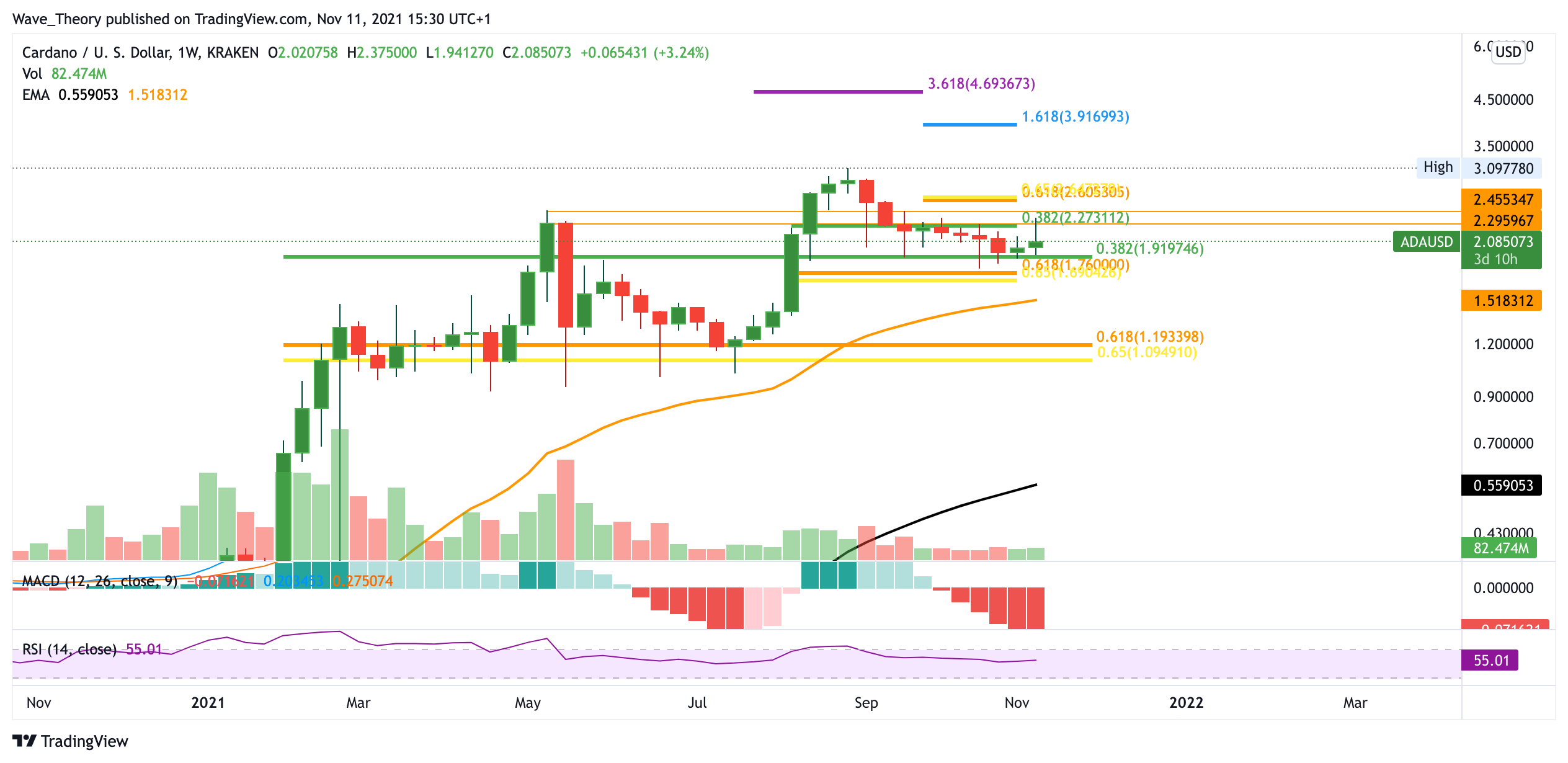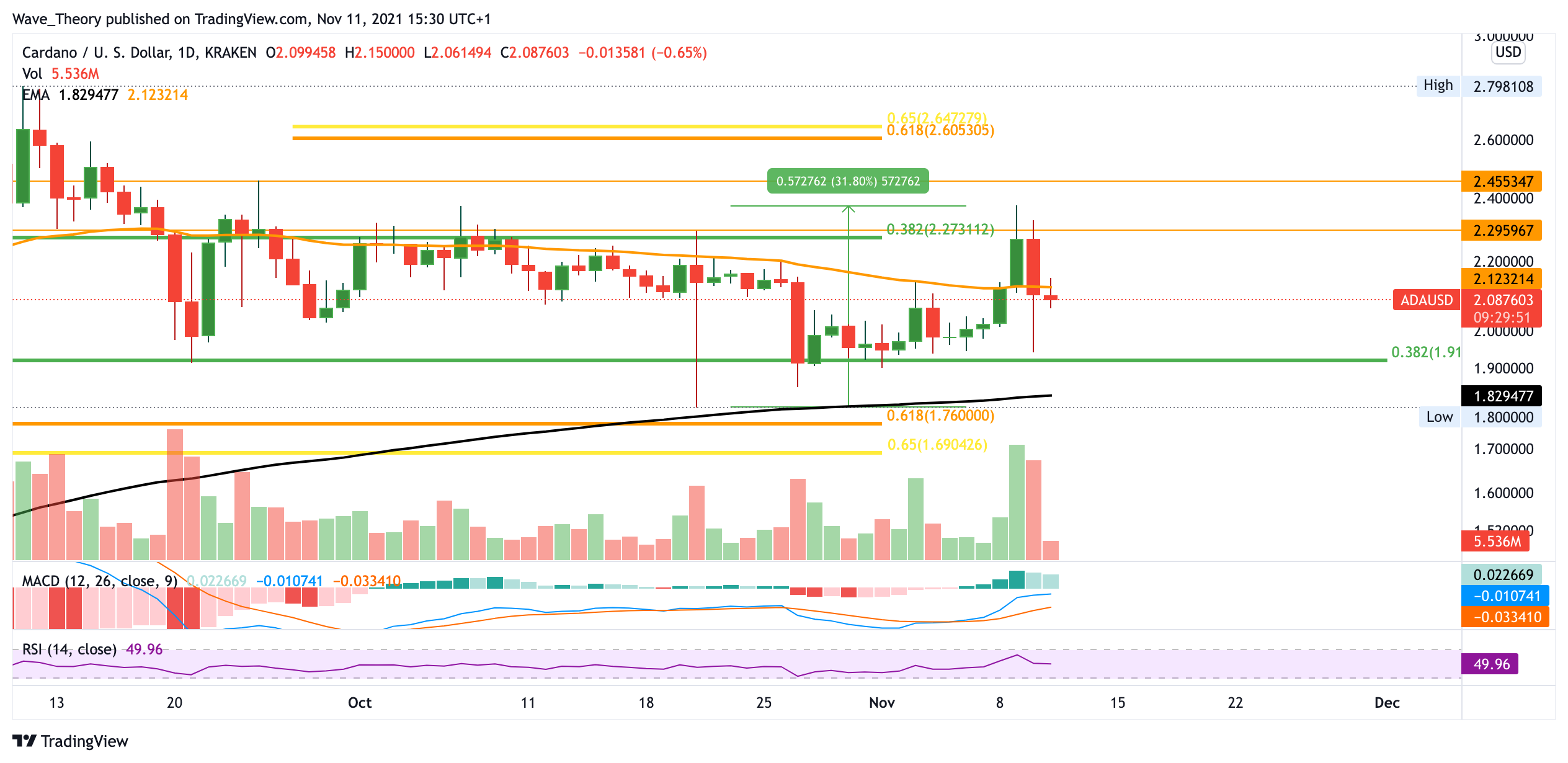 Tatsächlich konnte sich der Cardano Preis an dieser Unterstützung halten und stieg seither in wenigen Tagen rund 25%. Insgesamt stieg der ADA Kurs seit seinem letzten Tief Mitte Oktober rund 32%. Jedoch wurde der Cardano Kurs anschließend am Kursziel des Fibonacci Widerstands bei 2,27 USD abgewiesen. Durch diese starke Abweisung kehrte der Cardano Preis fast vollständig zur Fib Unterstützung bei 1,91 USD zurück. Nun zeigt sich das Histogramm des MACDs eher bärisch und aktuell kämpft Cardano mit dem 50-Tage-EMA Widerstand.