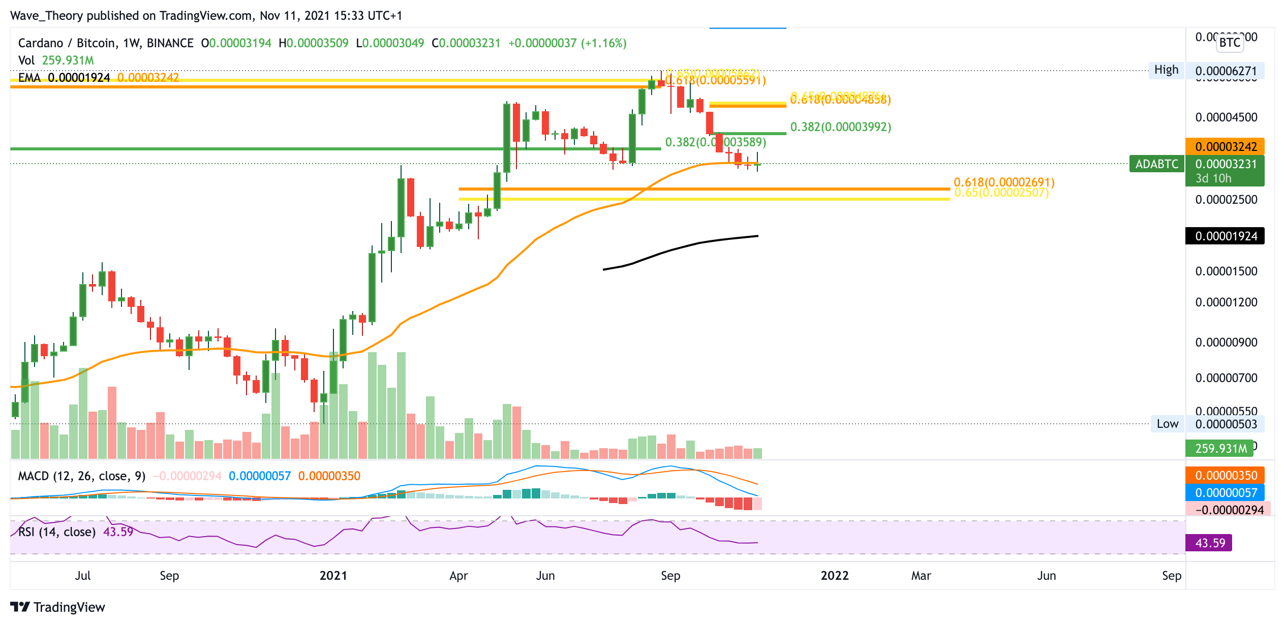 Gegen BTC erfolgte schon vor vielen Wochen eine bilderbuchartige Ablehnung am Golden Ratio Widerstand bei 0,000056 BTC. Seither befindet sich der ADA/BTC Kurs in einer Abwärtsbewegung. Auf Unterstützung stößt er momentan am 50-Wochen-EMA bei 0,0000324 BTC und später an der Golden Ratio bei 0,000026 BTC. Hier tickt das Histogramm des MACDs zumindest diese Woche höher, was Mut zur Hoffnung gibt, dass der ADA/BTC Kurs an besagten Unterstützungen abprallen könnte. Dabei stößt er dann bei rund 0,00004 BTC auf Widerstand.