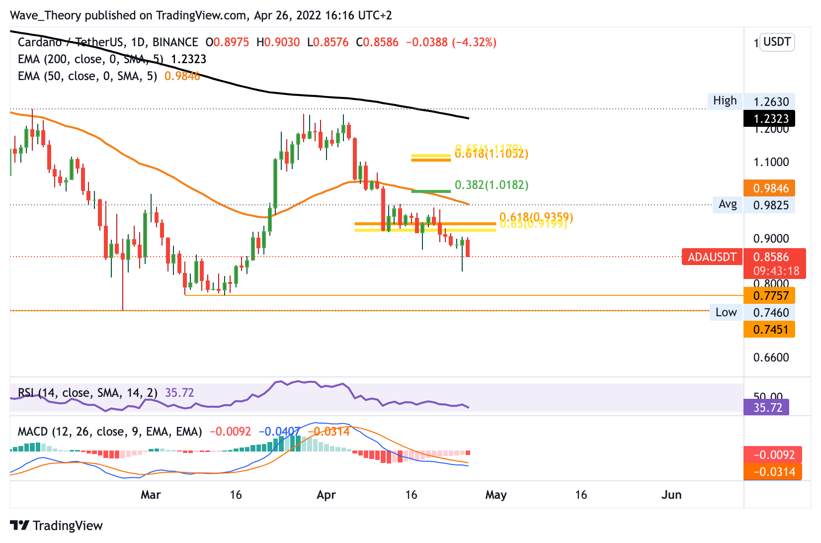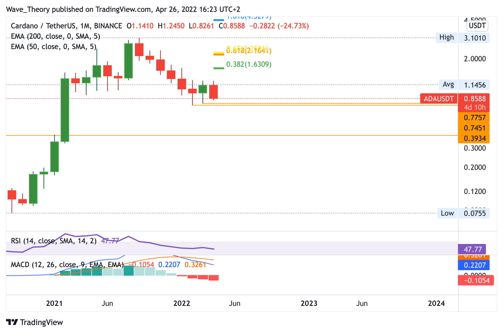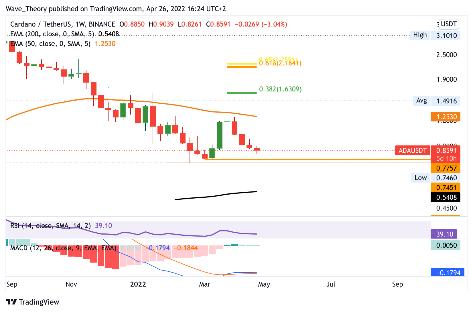 Die Fibonacci Widerstände bleiben weiterhin unerreicht und auch der 50-Wochen-EMA bei 1,25 USD konnte nicht überwunden werden. Stattdessen bewegt sich Cardano nun bereits in der vierten Woche weiter nach unten. Zudem zeigt sich auch das Histogramm des MACDs bärisch, denn dieses tickt bärisch tiefer. Wenn Cardano nicht an der Unterstützung zwischen 0,745 – 0,775 USD abprallen kann, sondern diese bärisch durchbricht, wartet bei 0,54 USD der 200-Wochen-EMA auf den ADA Kurs. Dort wartet die letzte Unterstützung auf den ADA Kurs, bevor es richtig tief geht.