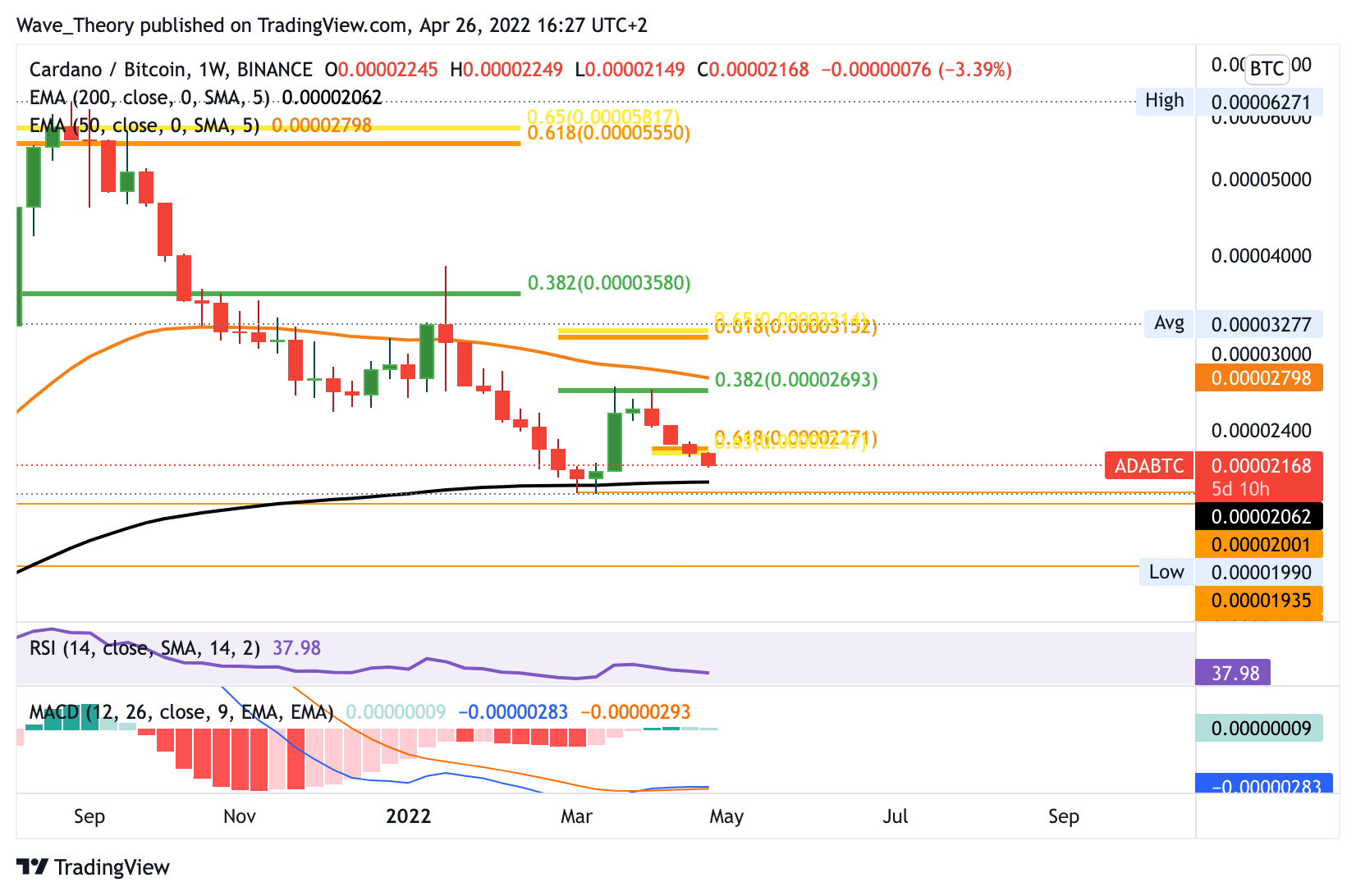 Auch gegen BTC sieht es aktuell bärisch für Cardano aus. Zuletzt wurde Cardano am 0,382 Fib Widerstand bei rund 0,000027 BTC bärisch abgewiesen, woraufhin Cardano nicht an der Golden Ratio Unterstützung bei rund 0,0000225 BTC abprallen konnte. Damit findet Cardano nun zwischen 0,00001935 – 0,00002062 BTC Unterstützung. Bricht der ADA Kurs dieses Preisniveau, findet er erst wieder bei 0,00001614 BTC Unterstützung.