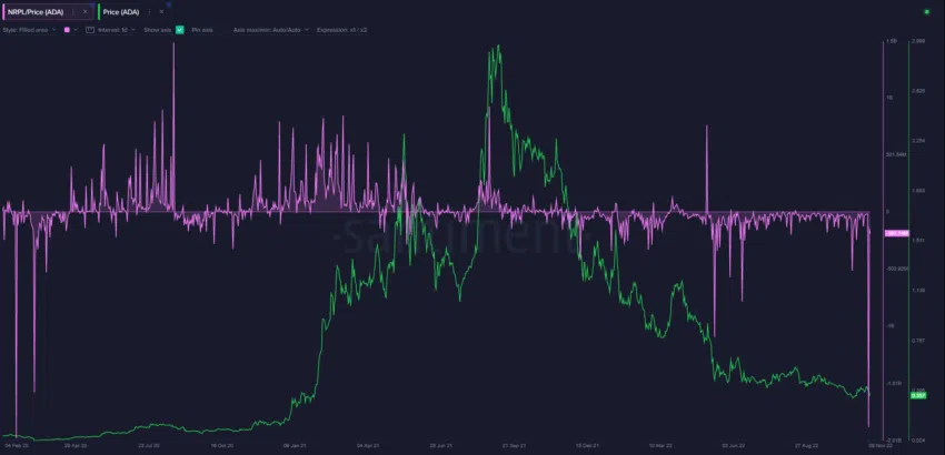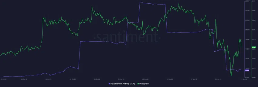 Laut den Daten von Sanbase erreichte die Entwicklungsaktivität von Cardano zeitgleich mit dem Preisanstieg am 2. November ein neues lokales Hoch. Als der Preis dann wieder fiel, ließ auch die Entwicklungsaktivität wieder nach.