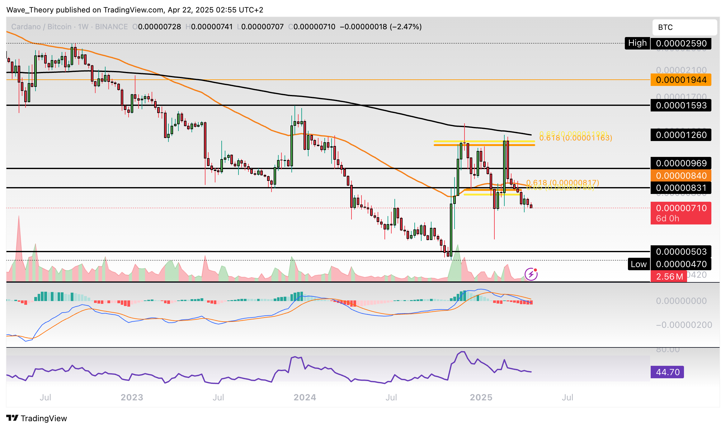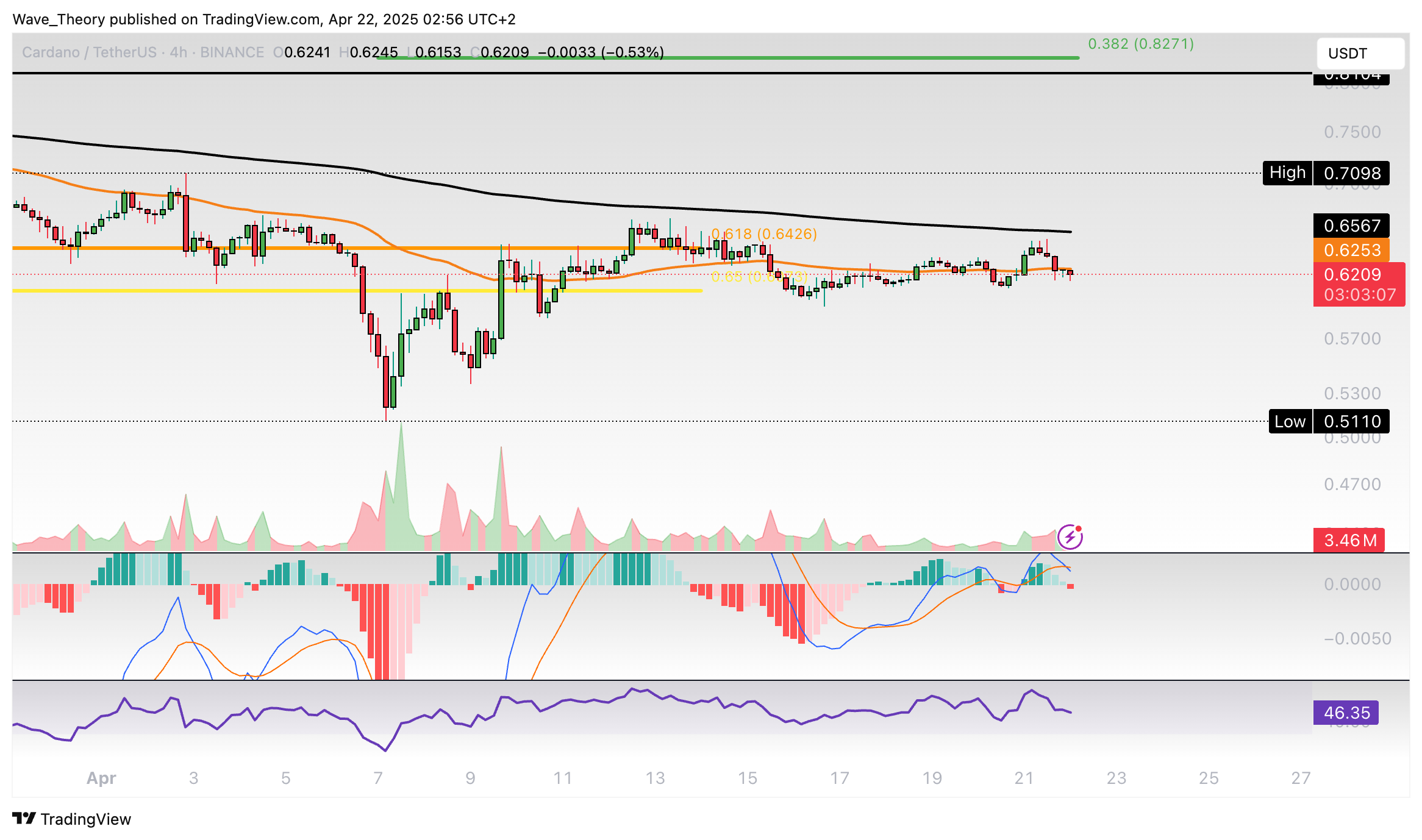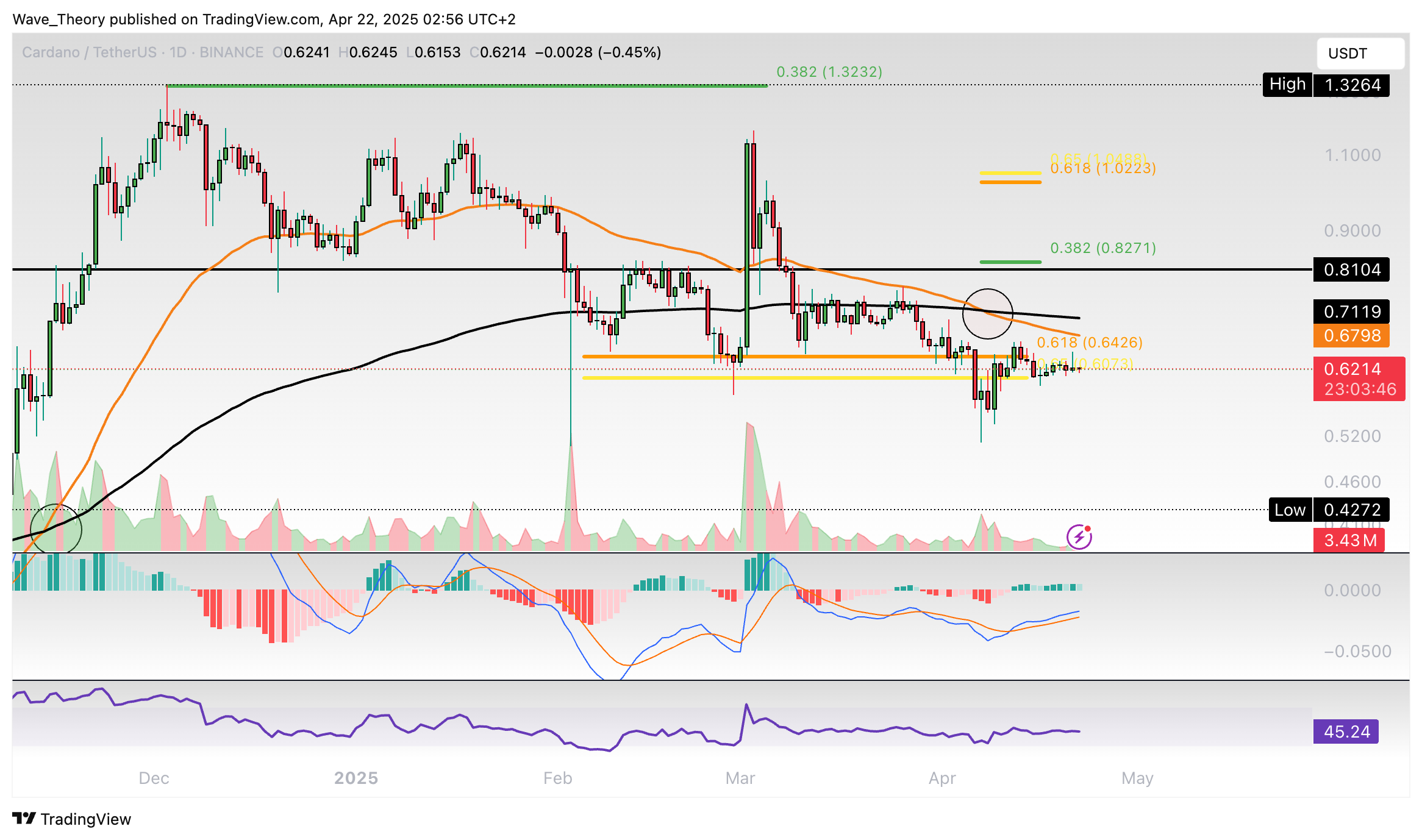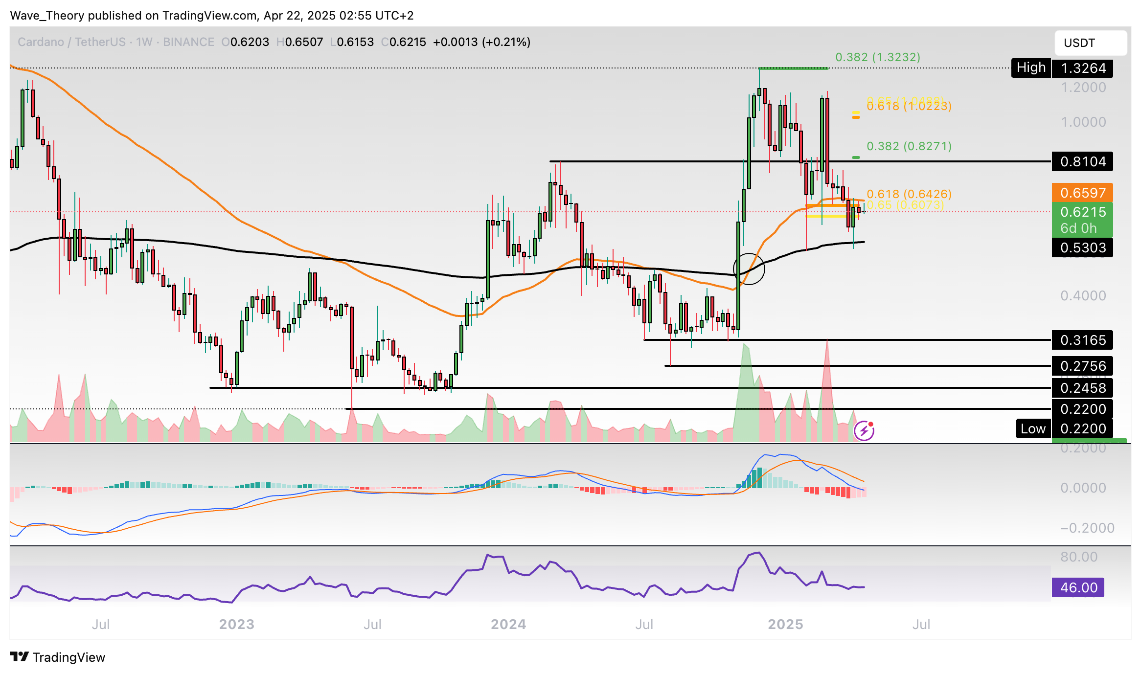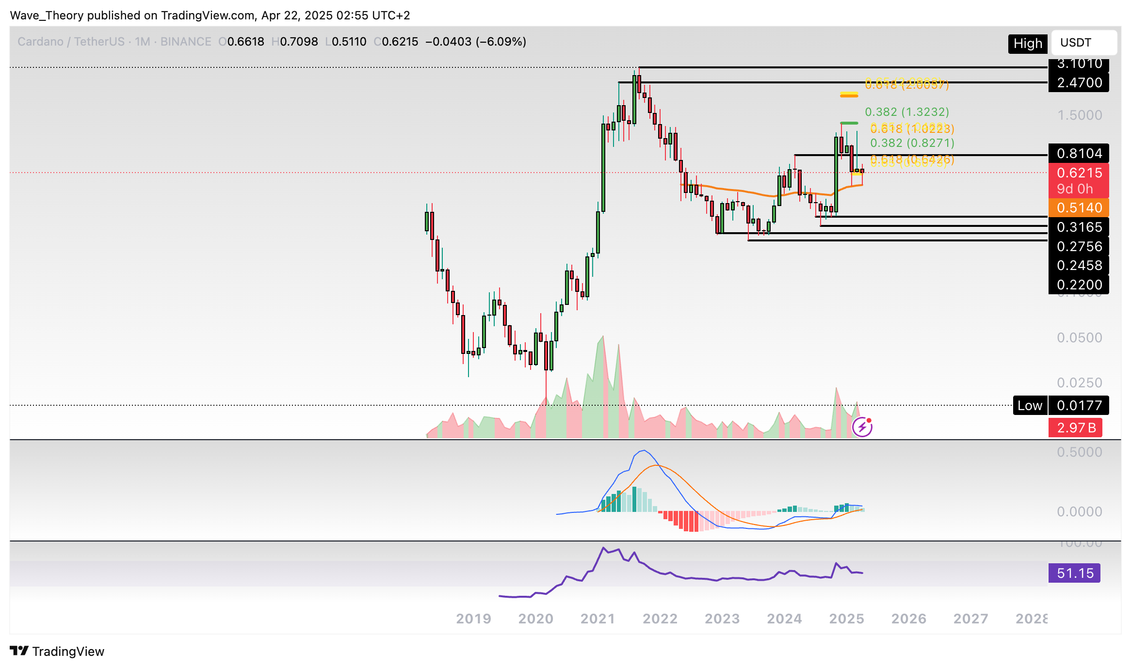 Der ADA Kurs konnte bisher an der 50-Monate-EMA Unterstützung bei rund 0,514 USD bullisch abprallen. Damit befindet sich Cardano jetzt knapp wieder an der Golden Ratio Unterstützung bei rund 0,64 USD.