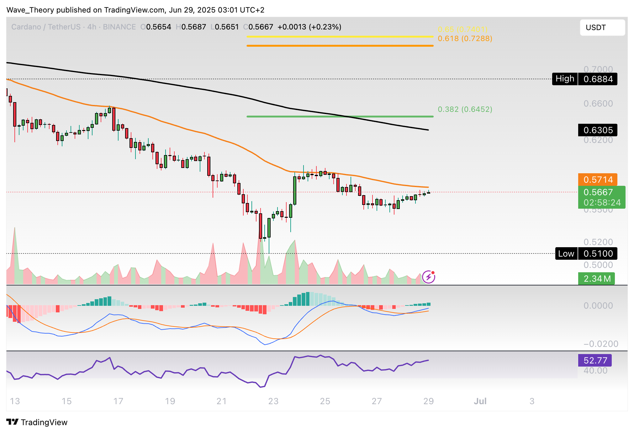 Im 4H-Chart kämpft der Cardano Kurs mit dem 50-4H-EMA