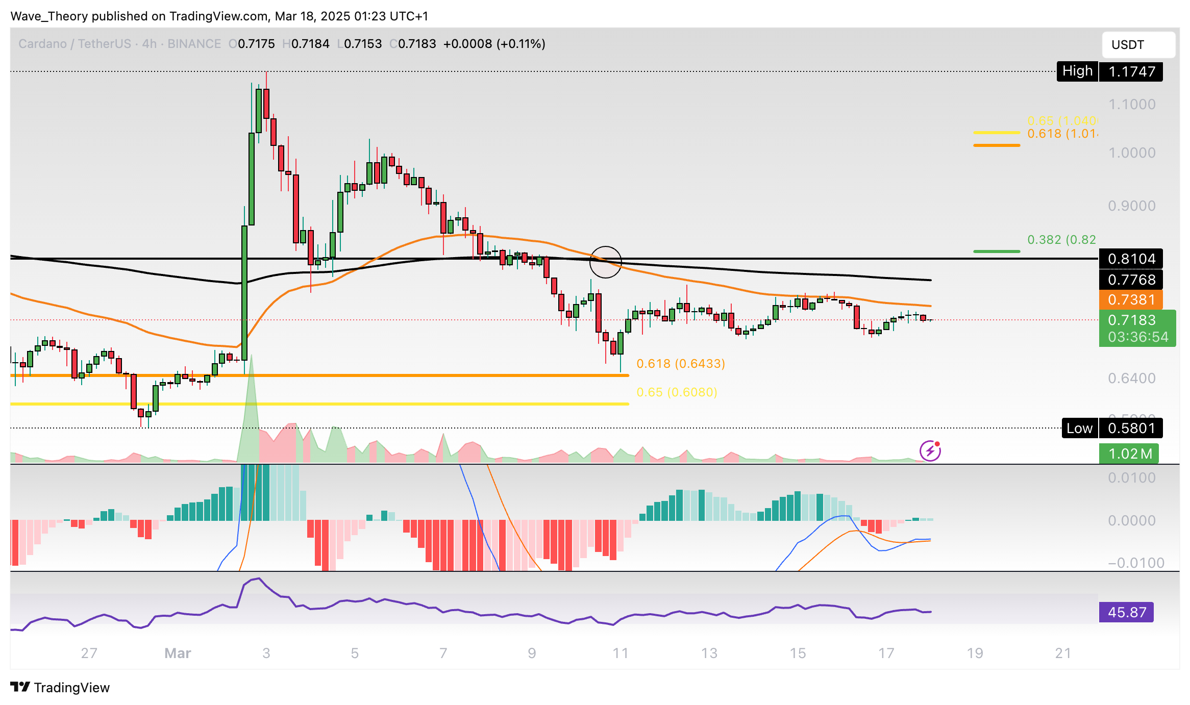 Bisher wurde Cardano seit des bullischen Abprallers an der Golden Ratio Unterstützung konsequent am 50-4H-EMA Widerstand bei rund 0,738 USD bärisch abgewiesen.