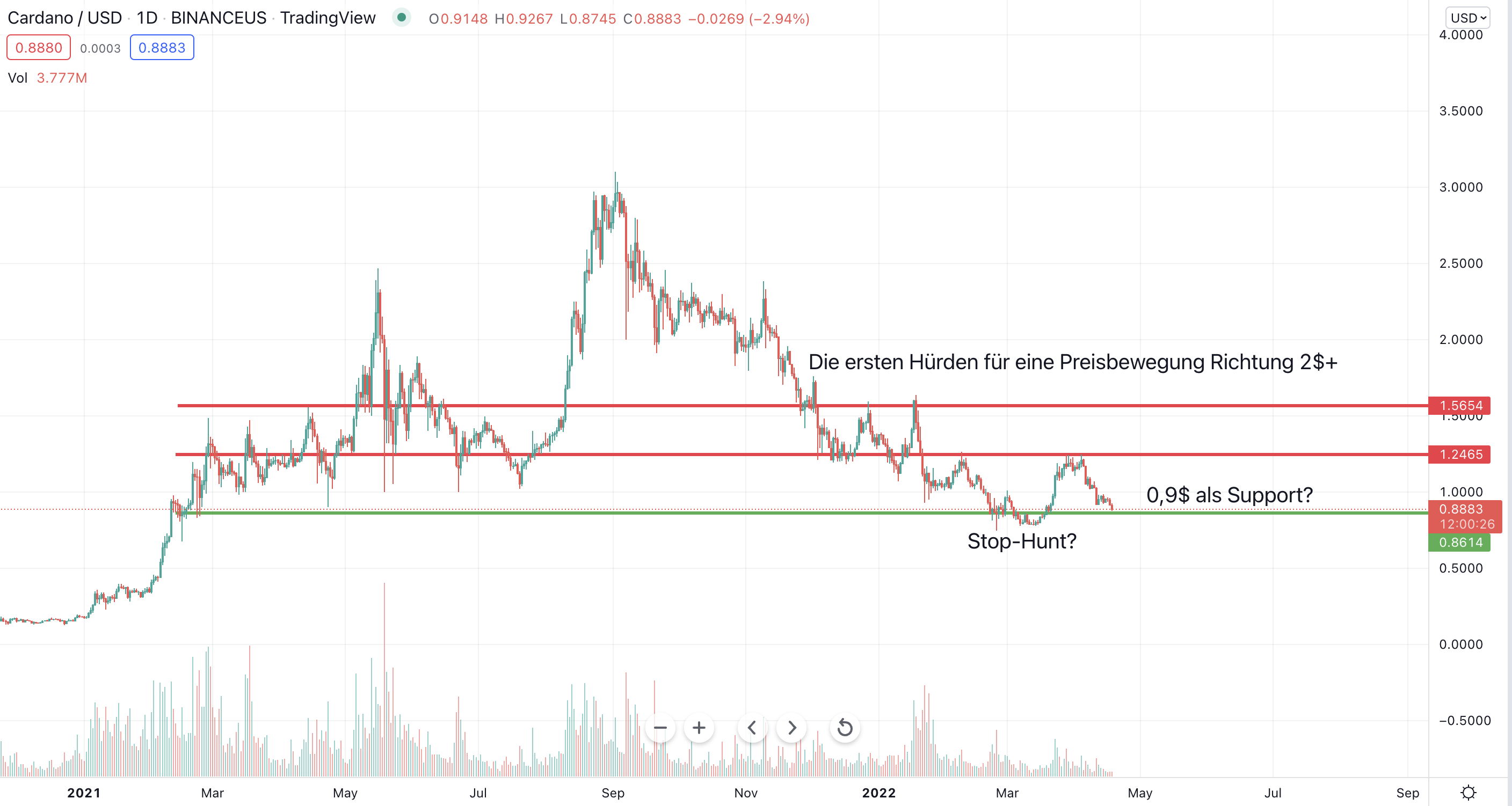 Zur Zeit des Artikels ist ein ADA für den Preis von 0,9 US-Dollar erhältlich. Es ist anzumerken, dass sich der globale Kryptomarkt seit Anfang November letzten Jahres in einem starken täglichen Abwärtstrend befindet, dem auch ADA folgt.