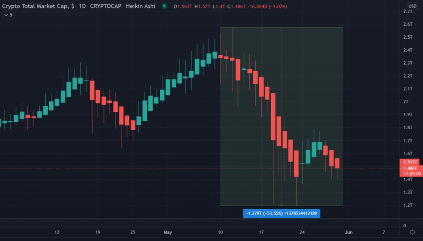 Der enorme Ausverkauf forderte seinen Tribut auf dem gesamten Markt. Die Gesamtmarktkapitalisierung ging gegenüber dem Mai-Hoch um über 53% zurück: ein Rückgang von 2,57 Billionen USD auf ein Monatstief von 1,19 Billionen USD.