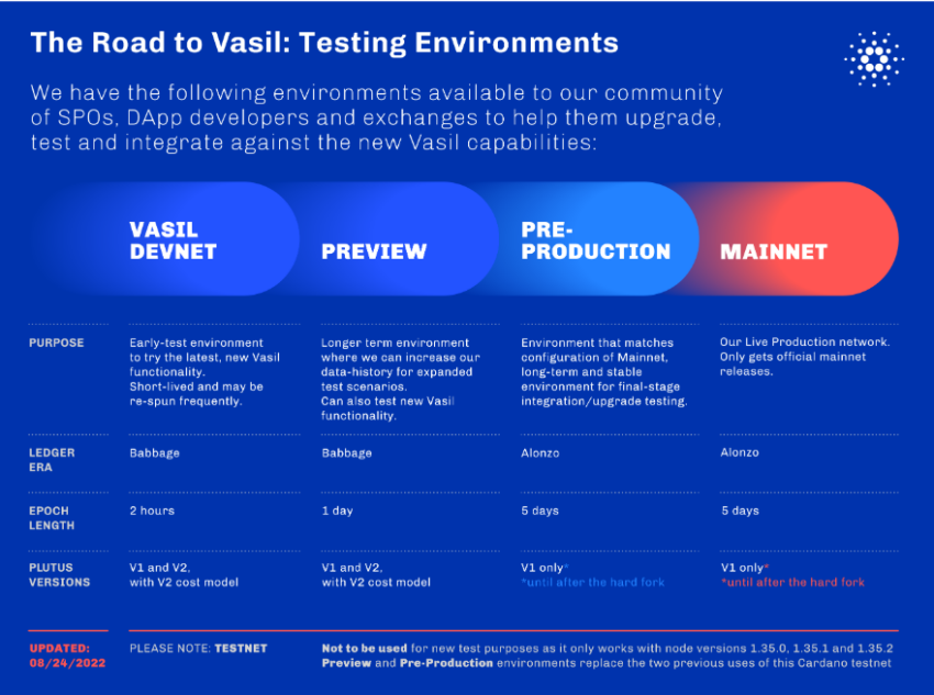 Die Pre-Production-Chain ist nicht nur an die Cardano-Main-Chain angepasst, sondern dient auch als langfristige Testumgebung für Cardano dApps. Cardano dApps werden zuerst im Vasil Devnet, dann im Preview-Testnet und zum Schluss im Pre-Production-Testnet überprüft. Erst dann sind diese für das Mainnet einsatzbereit.