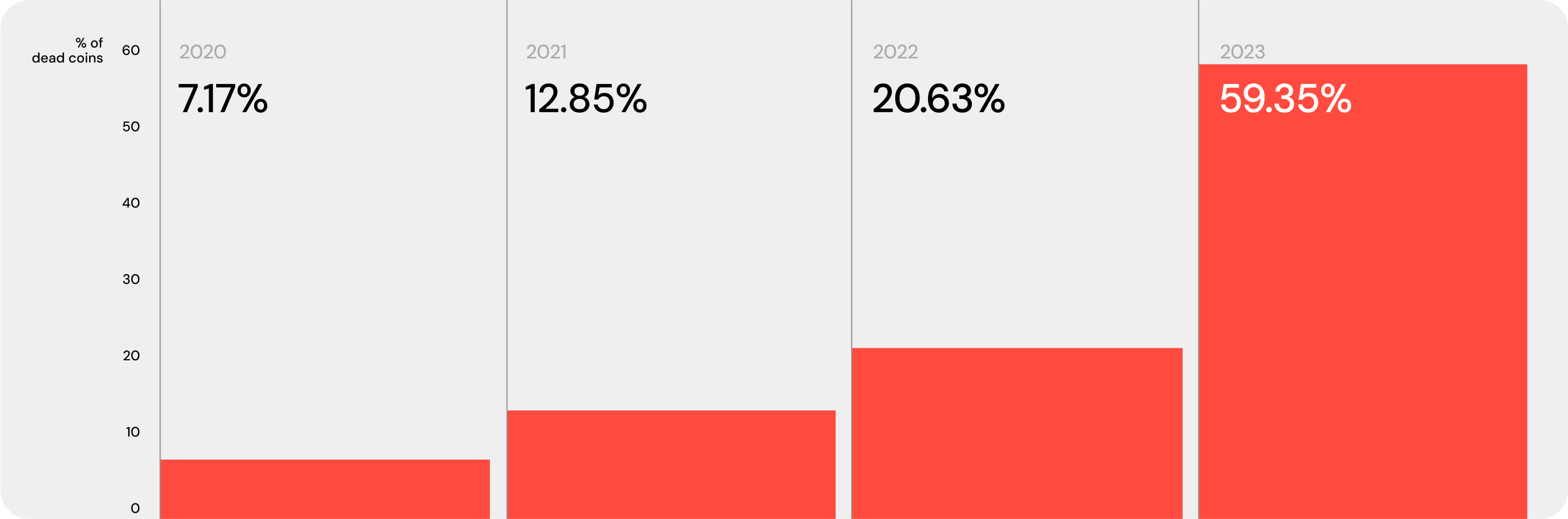 Die zur Klassifizierung verwendeten vier Kriterien waren niedriges Handelsvolumen/Liquidität, inaktive/gelöschte Adressen, eingestellte Websites und Delisting von CoinMarketCap. Interessanterweise starben die meisten Projekte im Jahr 2023 – fast 60 Prozent. Dabei verzeichneten 93 Prozent ein niedriges Handelsvolumen und eine geringe Liquidität, während 58 Prozent gelöschte oder inaktive Wallets bzw. Websites aufwiesen.