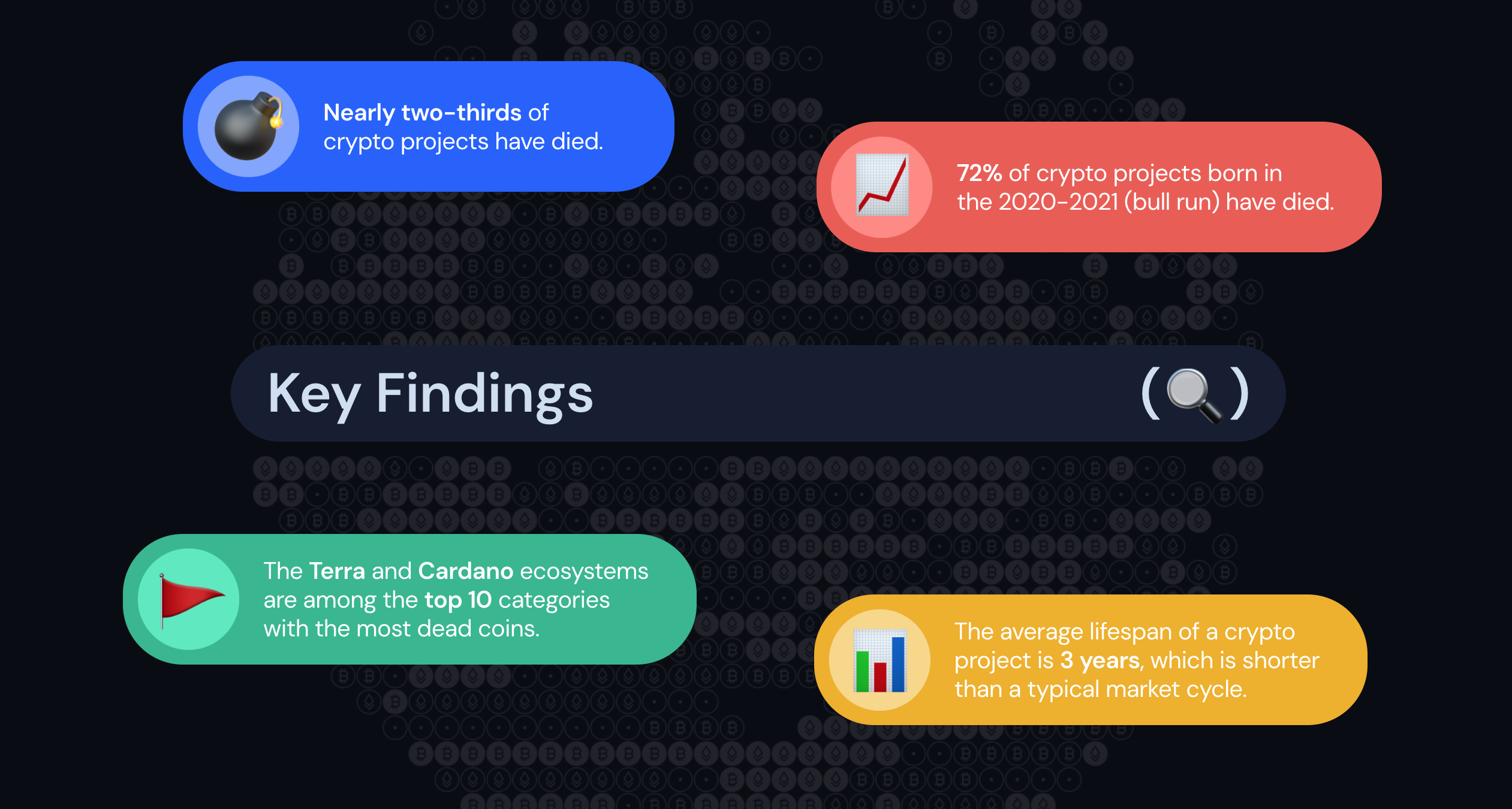 Die Analyse befasste sich mit über 12.000 Projekten in verschiedenen Ökosystemen, wobei Terra/Luna und Cardano mit Abstand am schlechtesten abschnitten. In beiden Netzwerken starben in besagtem Zeitraum satte 74 Prozent, wobei diedurchschnittliche Lebensdauer der meisten Kryptowährungen lediglich drei Jahre betrug.