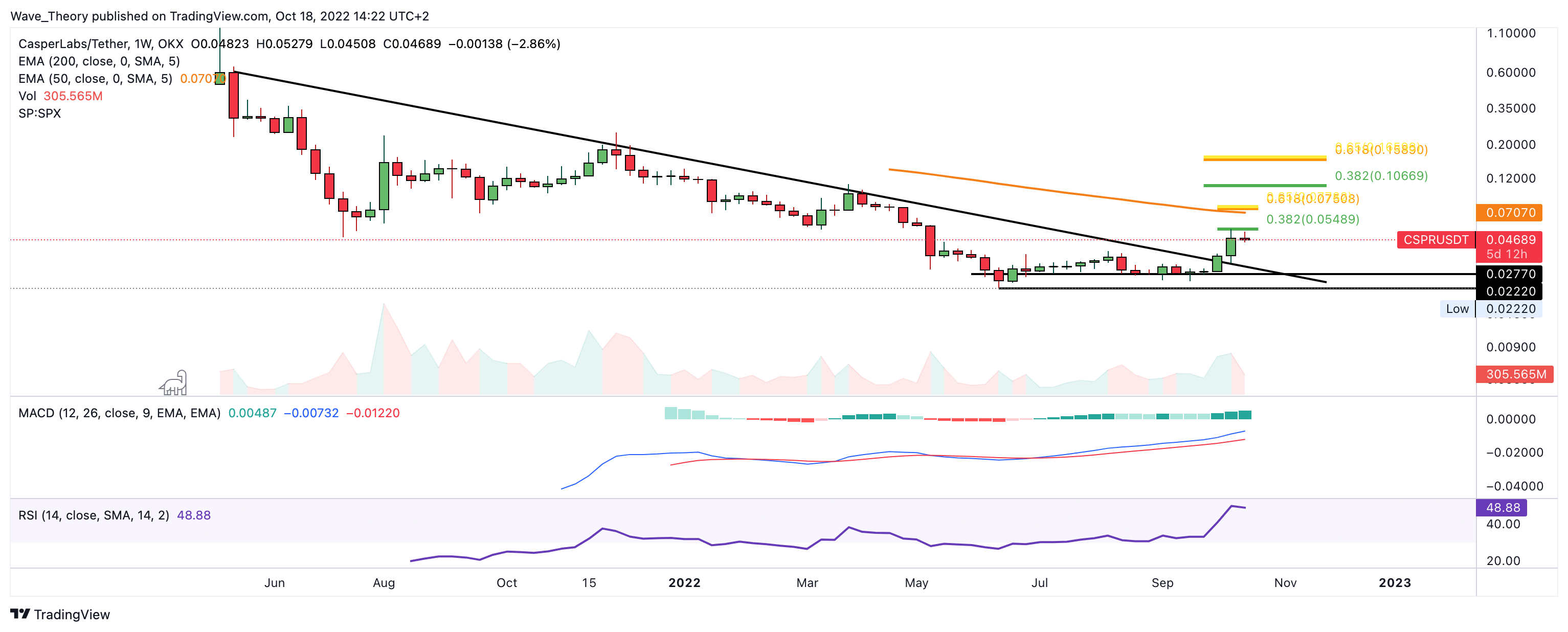 Letzte Woche konnte der Casper Kurs die bärische Trendlinie brechen, welche sich über den Zeitraum von Juni letzten Jahres bis heute erstreckt. Damit stößt Casper jetzt bei rund 0,55 USD auf signifikanten Fibonacci Widerstand.