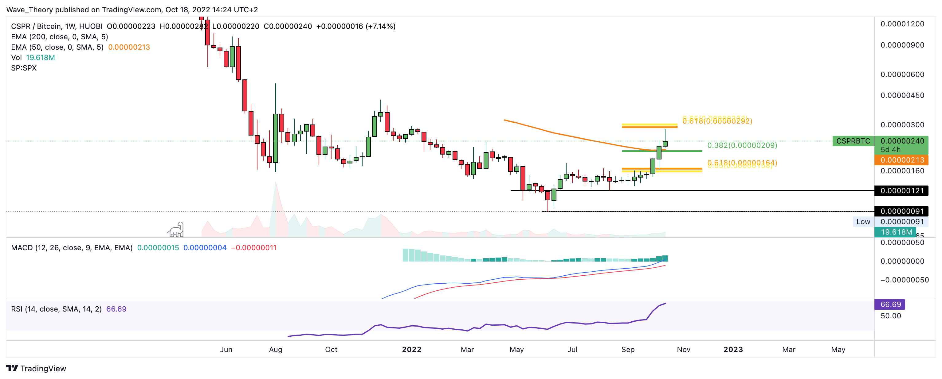 Gegen BTC erreicht der CSPR Kurs Golden Ratio Widerstand