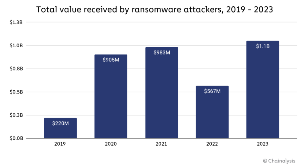 Ransomware beinhaltet den Einsatz von Malware, die den Zugriff auf Computersysteme oder Daten einschränkt und üblicherweise ein Lösegeld in Krypto für deren Freigabe fordert. Die Blockchain-Analysefirma Chainalysis stellte fest, dass die Zahlungen aus krypto-bezogenen Ransomware-Angriffen im Jahr 2023 auf über 1 Milliarde USD nahezu verdoppelt haben.