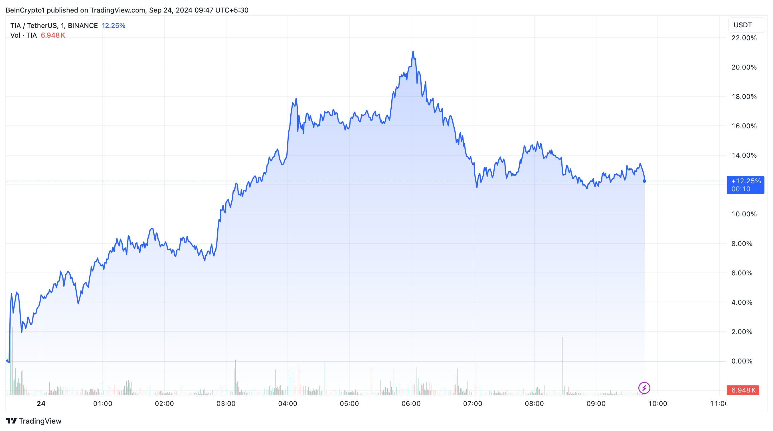Nach der Ankündigung reagierte der Markt positiv. Der native Coin, TIA, stieg um fast 21 Prozent im Wert, stabilisierte sich später jedoch bei einem Anstieg von 12,25 Prozent. Derzeit wird TIA zu 6,40 USD gehandelt, mit einer Marktkapitalisierung von 1,36 Milliarden USD. Trotz dieses Anstiegs liegt der Coin immer noch über 65 Prozent unter seinen Höchstständen von Februar 2024.