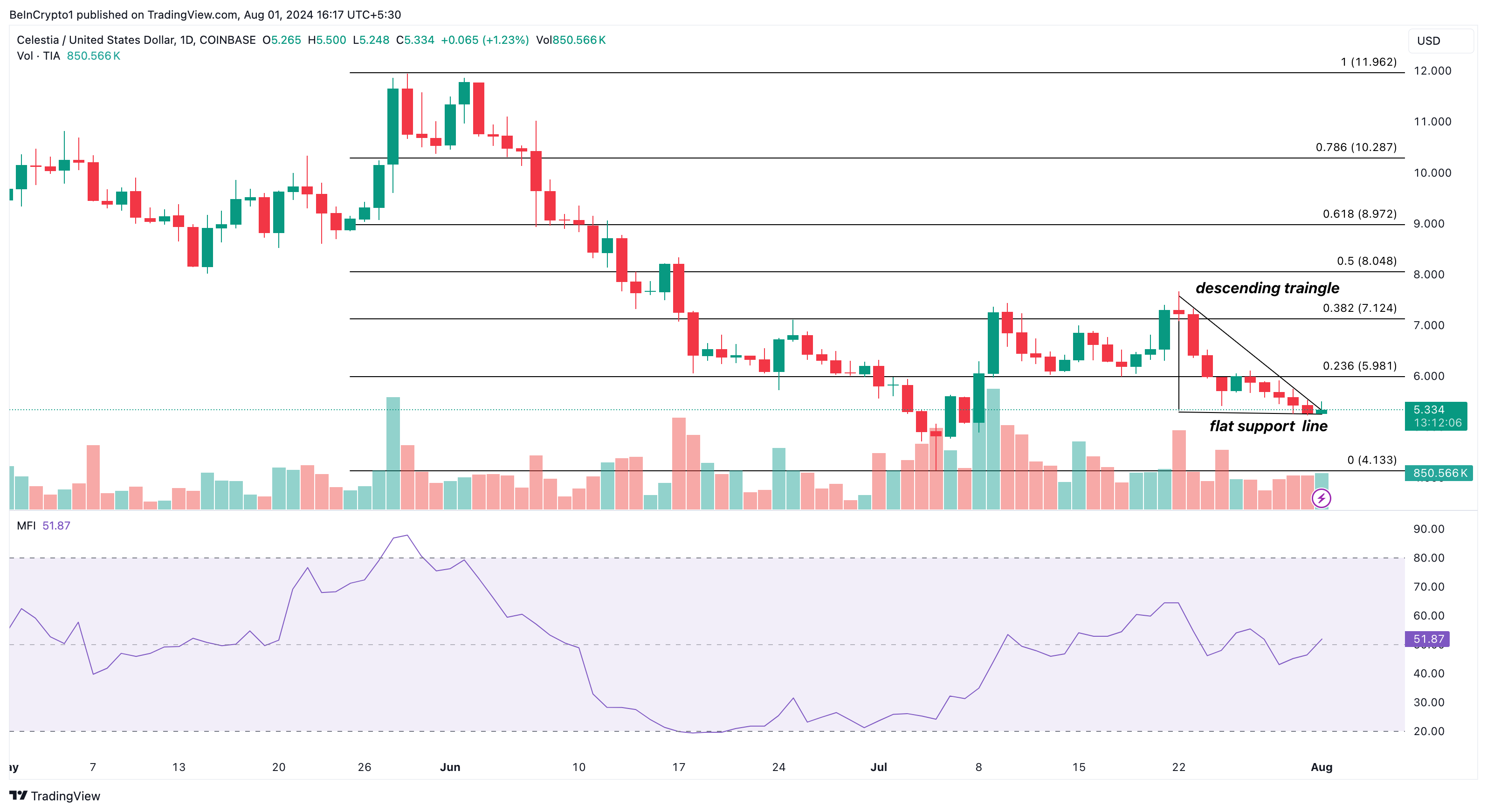 TIA handelt seit dem 22. Juli in einem absteigenden Dreieck. In diesem Muster erreicht der Kurs immer niedrigere Höchststände, während die flache Unterstützungslinie sich um denselben Bereich konsolidiert.