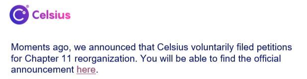 Celsius soll zusammen mit einigen Tochterunternehmen freiwillig das Verfahren nach Chapter 11 (Kapitel 11) des amerikanischen Insolvenzrechts eingeleitet haben. Dass Celsius noch 167 Millionen Cash-Reserven besitzt, kommt dem Unternehmen nun zugute.