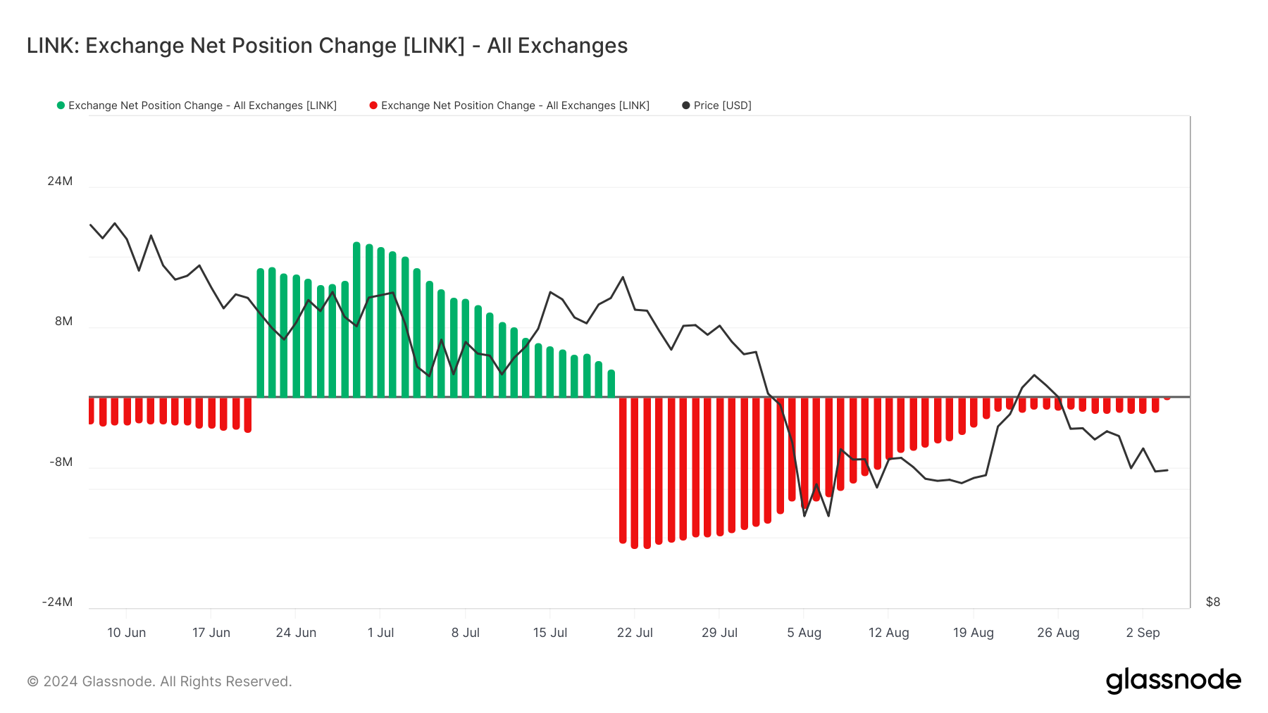 Laut Glassnode sinkt dieser Wert seit Ende Juli, was darauf hindeutet, dass Marktteilnehmer eher dazu neigen, LINK zu halten als zu verkaufen. Allerdings hat sich das Tempo, mit dem Coins von den Börsen entfernt werden, im Vergleich zu den Vorwochen verlangsamt.