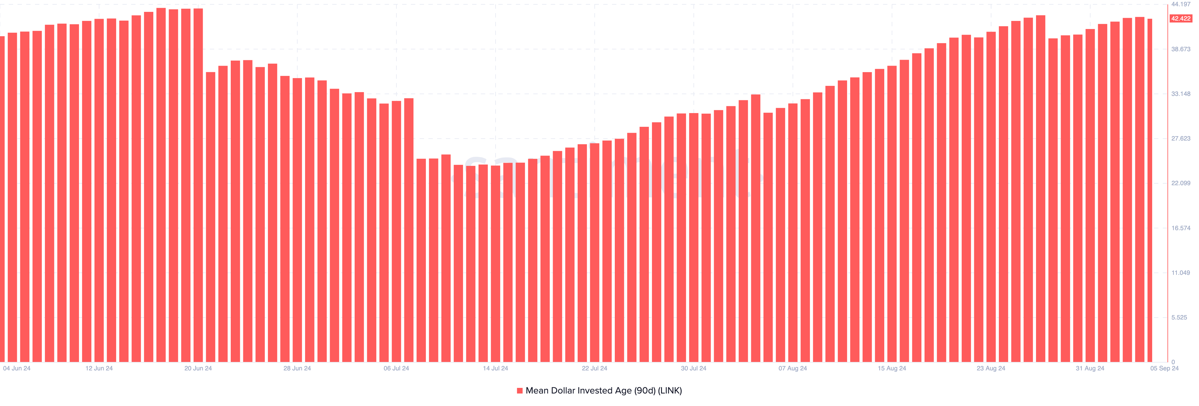 Normalerweise könnten solche Entwicklungen zu einem signifikanten Anstieg des LINK Kurses führen. Jedoch zeigt Santiment-Daten, dass das 90-Tage Mean Dollar Investment Age (MDIA) seit dem 28. August steigt.