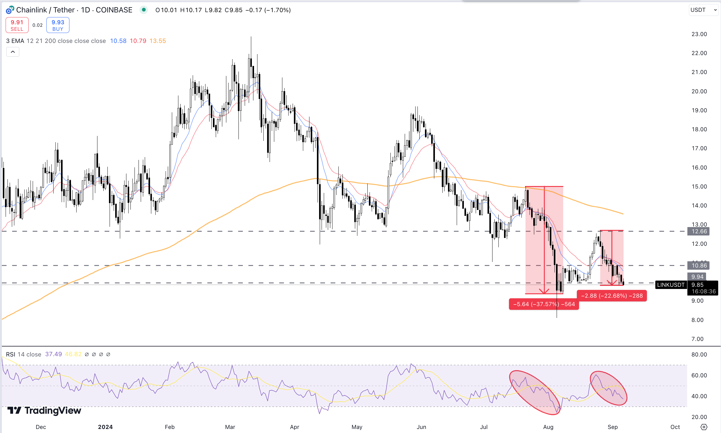Das letzte Mal, als der Coin eine ähnliche Bewegung erlebte, fiel der Preis auf 9,44 USD. Derzeit wird Chainlink zu etwa 9,85 USD gehandelt. Dabei besteht die Gefahr, dass der Coin bis auf etwa 7,68 USD fallen könnte.