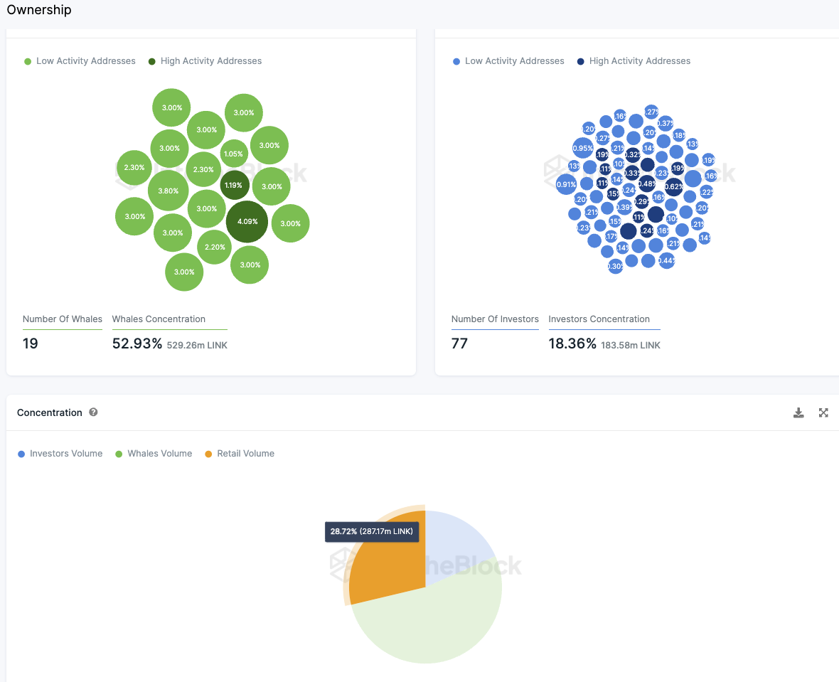Es gibt dabei knapp 19 Wal Adressen, die zusammen rund 53 % der LINK Token halten. Daneben existiert auch eine große Anzahl institutioneller Anleger, die Anteile zwischen 0,1 % und 1 % besitzen. Diese Gruppe von etwa 77 Großinvestoren hält insgesamt etwa 18,36 % der Chainlink Token.