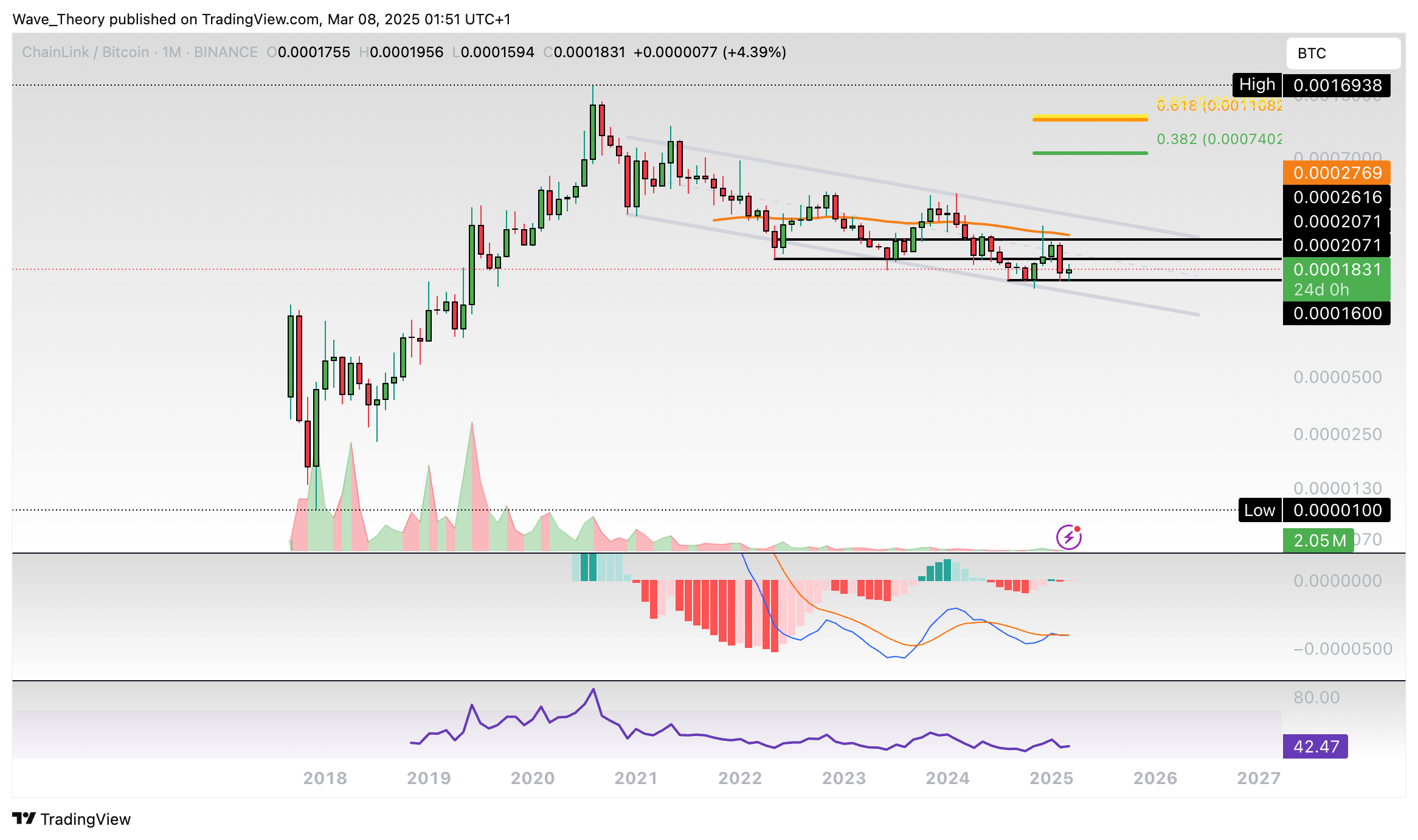 Gegen BTC befindet sich Chainlink in einem massiven Abwärtstrend. Er bewegt sich seit einigen Jahren in einem parallelen Abwärtskanal.