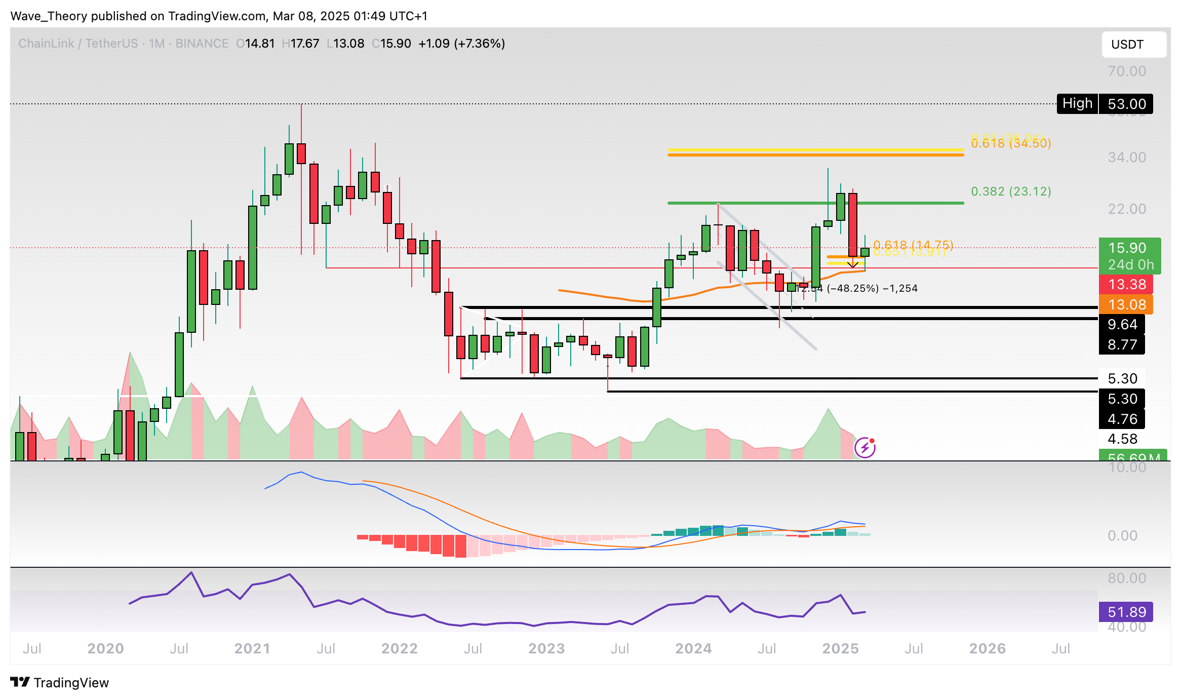 Der LINK Kurs konnte den Golden Ratio Widerstand bei rund 35 USD nicht überwinden, womit sich Chainlink immer noch in einem Abwärtstrend befindet. Dabei ist der Kurs letzten Monat heftig gefallen, womit der Kurs jetzt die 50-Monate-EMA Unterstützung bei rund 13 USD erreicht hat.