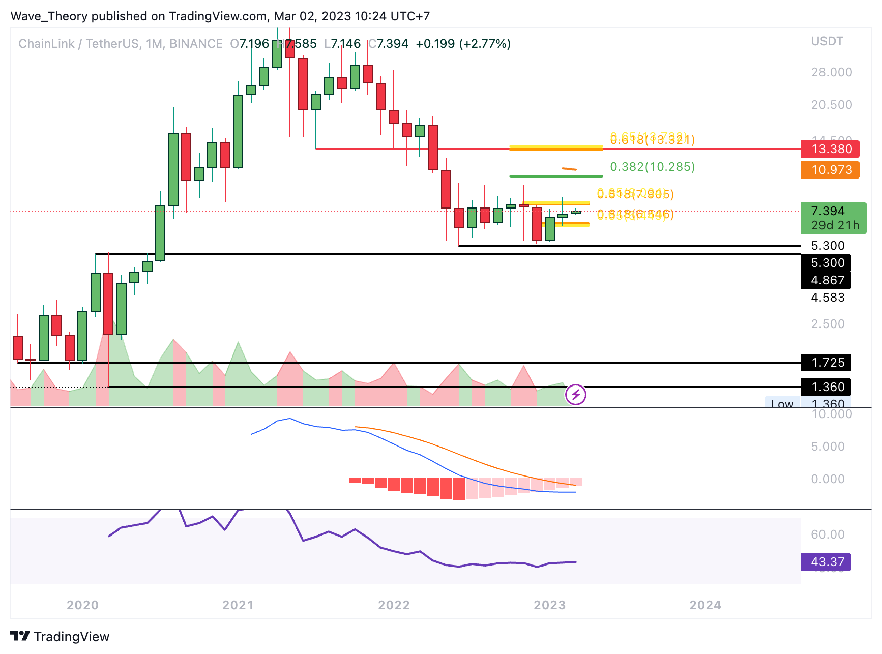 Im Monatschart konnte Chainlink keine “Bullish-Engulfing-Candle” formen. Dennoch tickt das Histogramm des MACDs seit vielen Monaten bullisch höher. Die MACD Linien sind aber noch bärisch überkreuzt und der RSI bewegt sich in neutralem Territorium.