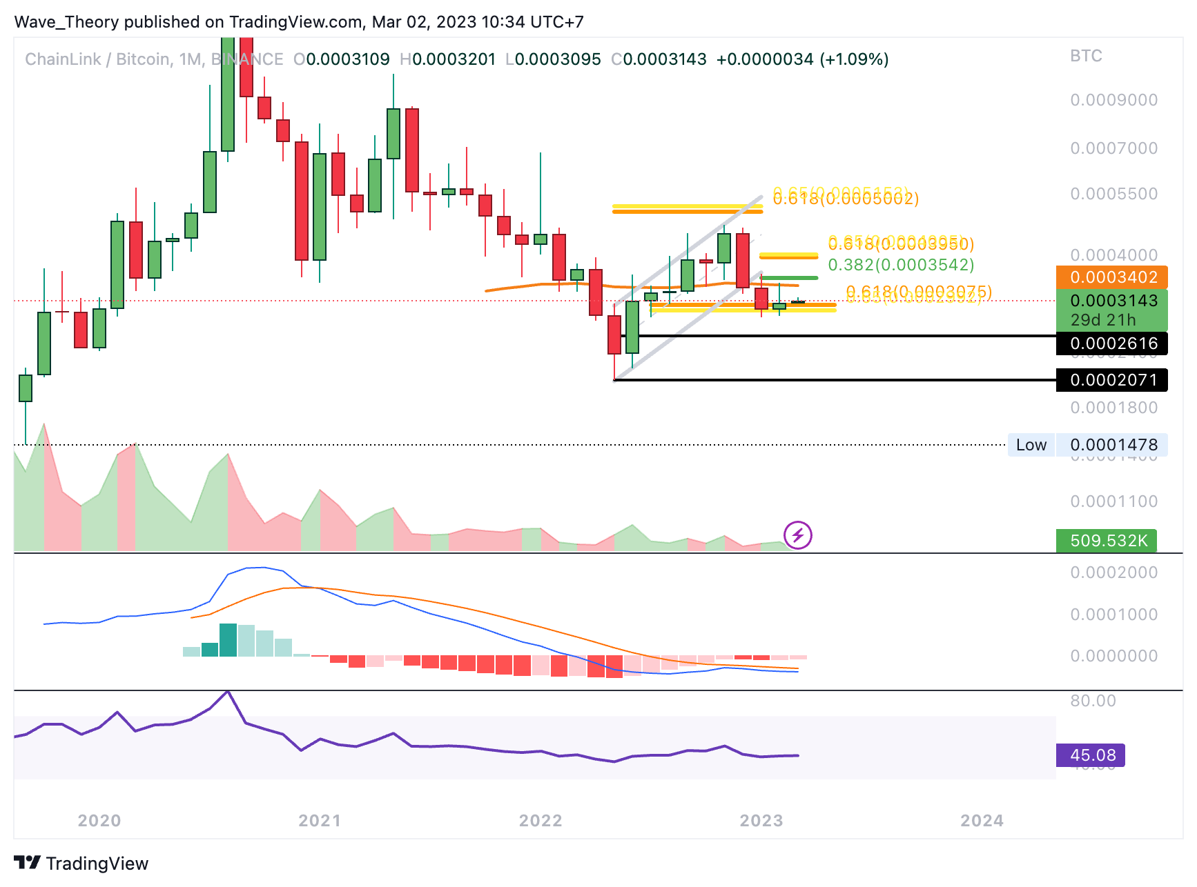 Gegen BTC erreichte Chainlink die Golden Ratio Unterstützung bei rund 0,0003 BTC, woran der LINK Kurs zunächst abprallen konnte. Doch anschließend wurde Chainlink am 50-Monate-EMA Widerstand bei rund 0,00034 BTC bärisch abgewiesen.