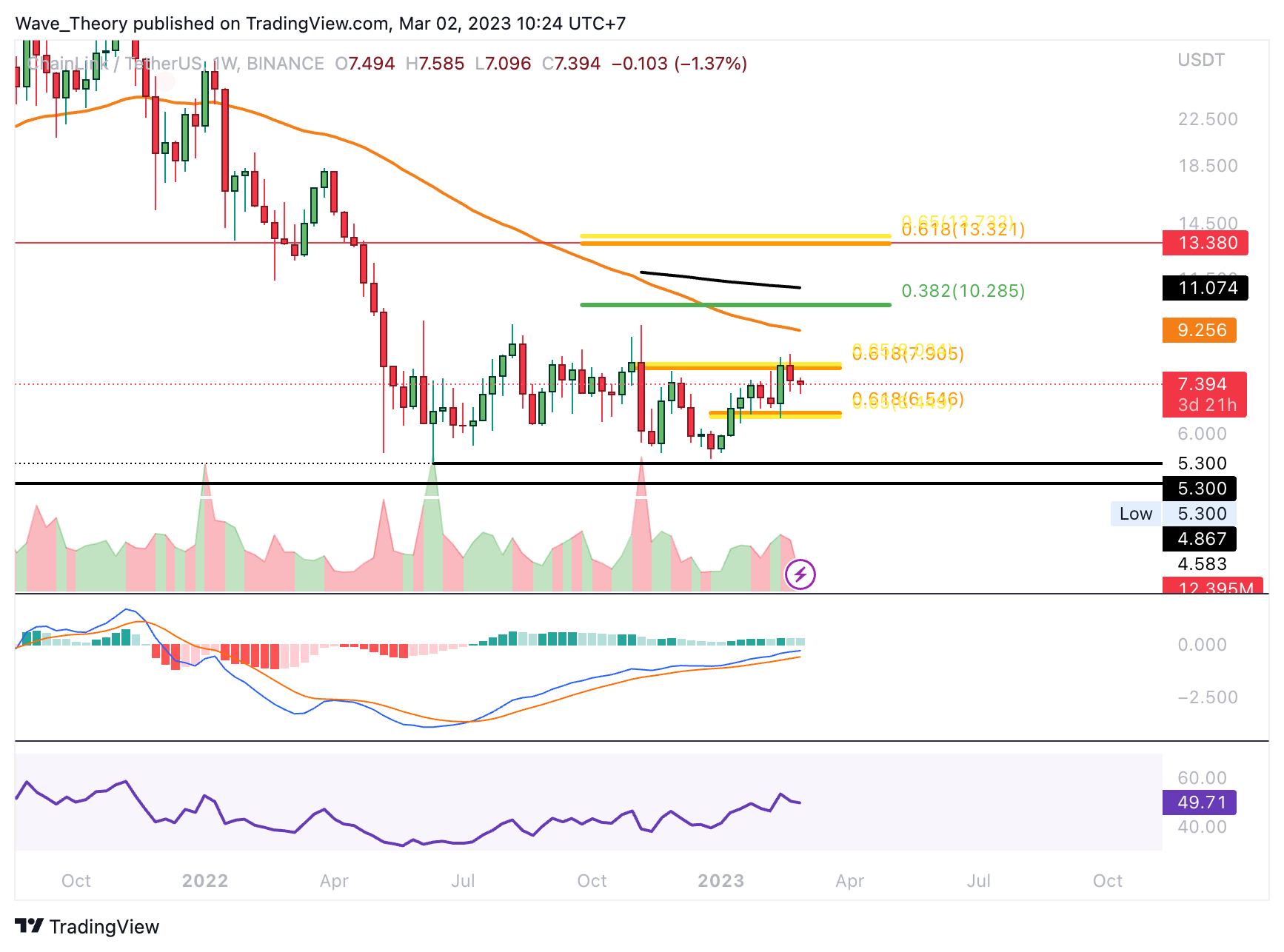 Aufgrund der starken Abweisung am Golden Ratio Widerstand bei rund 8 USD könnte Chainlink mittelfristig zur Golden Ratio Unterstützung bei rund 6,5 USD zurückkehren. Ansonsten fungiert der 50-Wochen-EMA bereits bei rund 9,25 USD als signifikanter Widerstand.