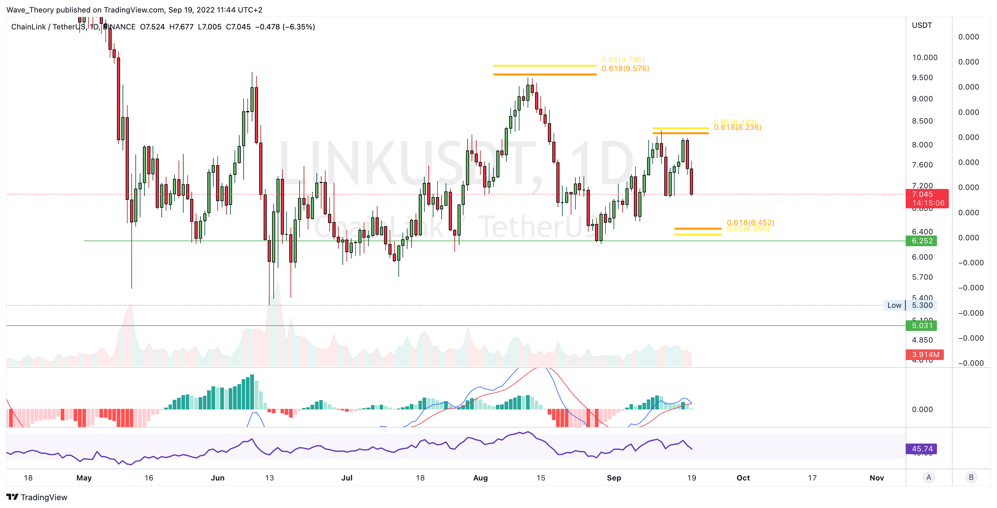 In der letzten Chainlink Kurs Prognose, welche bereits drei Wochen zurückliegt, schrieben wir: “Der Chainlink Kurs kehrte erneut zur Unterstützung zwischen rund 5 USD und rund 6,25 USD zurück, woran Chainlink abprallen konnte. Damit findet Chainlink jetzt bei rund 7,5 USD und 8,3 USD die nächsten signifikanten Fibonacci Widerstände. Ohne ein Bruch des Golden Ratio Widerstands bei rund 8,3 USD bleibt die Korrektur intakt. Sollte der LINK Kurs die Golden Ratio bei rund 8,3 USD nicht bullisch brechen können, könnte der LINK Kurs mittelfristig zum letzten Tiefpunkt bei rund 5,3 USD zurückkehren.“