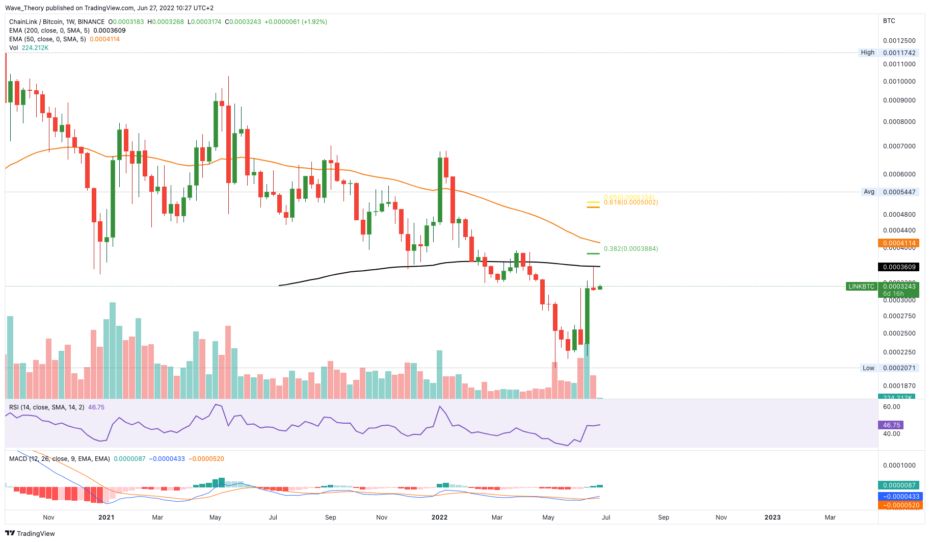 Wird Chainlink erneut am 200-Wochen-EMA abgewiesen, erwartet Chainlink bei rund 0,0003 BTC und 0,00026 BTC signifikante Fib Unterstützung.