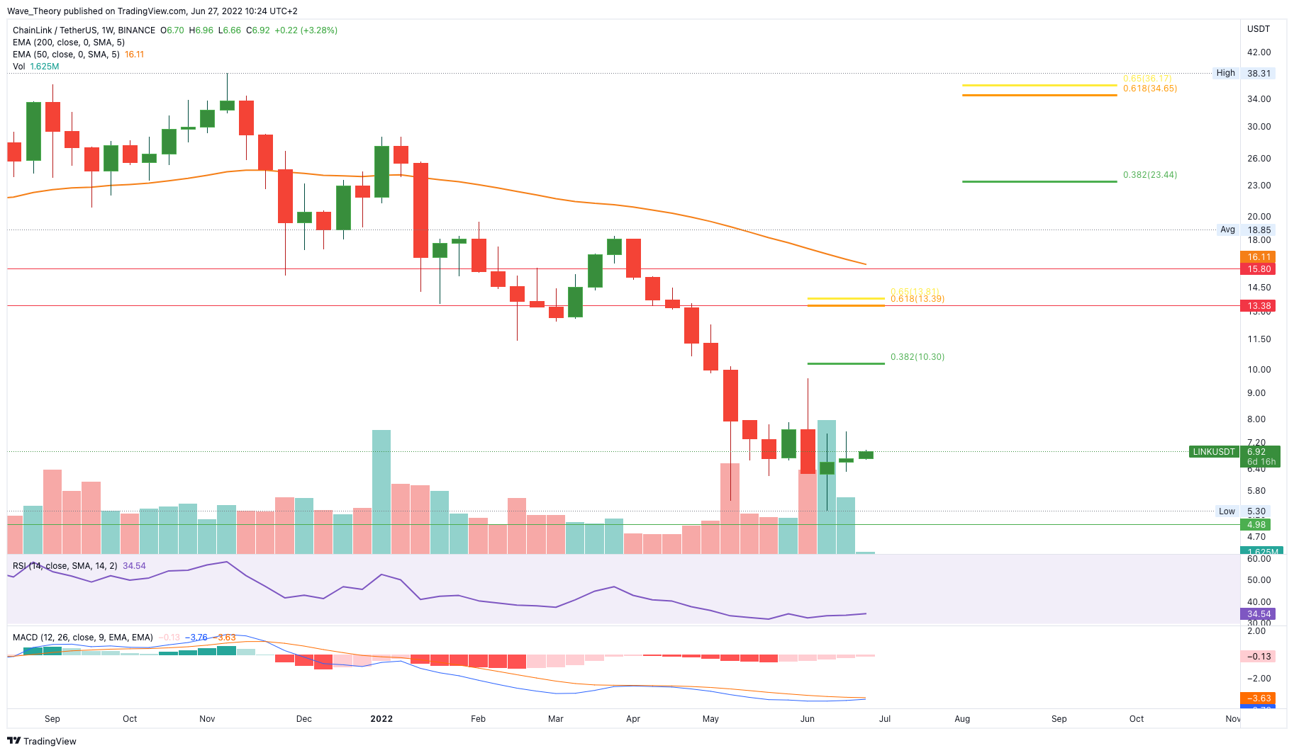Sollte Chainlink den Widerstand zwischen 13,4 – 16 USD brechen, könnte der LINK Kurs zum 0,382 Fib Niveau bei rund 23,5 USD steigen. Bei rund 16 USD fungiert der 50-Wochen-EMA als zusätzlicher Widerstand.