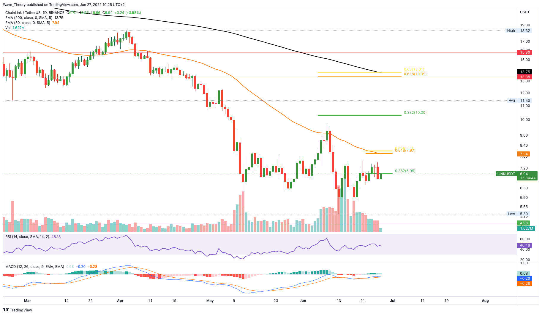 Nichtsdestotrotz konnte Chainlink bereits den ersten Fib Widerstand bei rund 7 USD bullisch brechen, womit der LINK Kurs jetzt zur Golden Ratio am 50-Tage-EMA bei rund 8 USD steigen könnte.